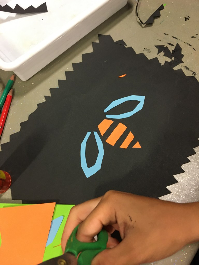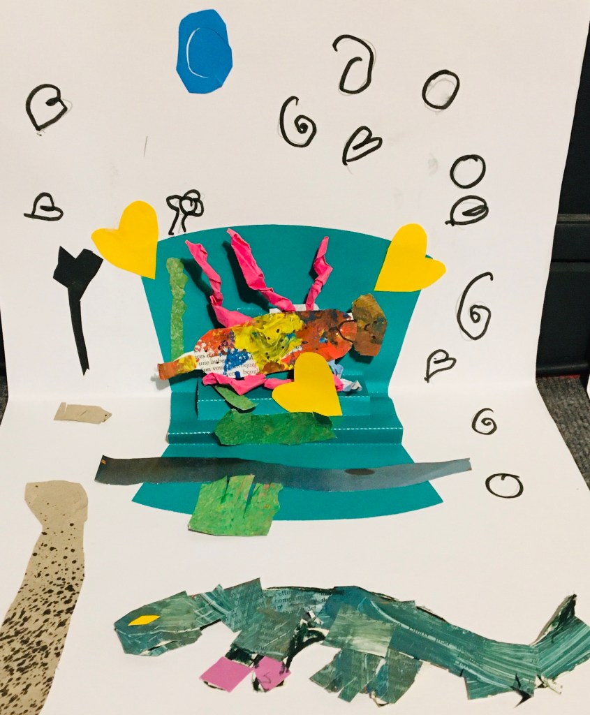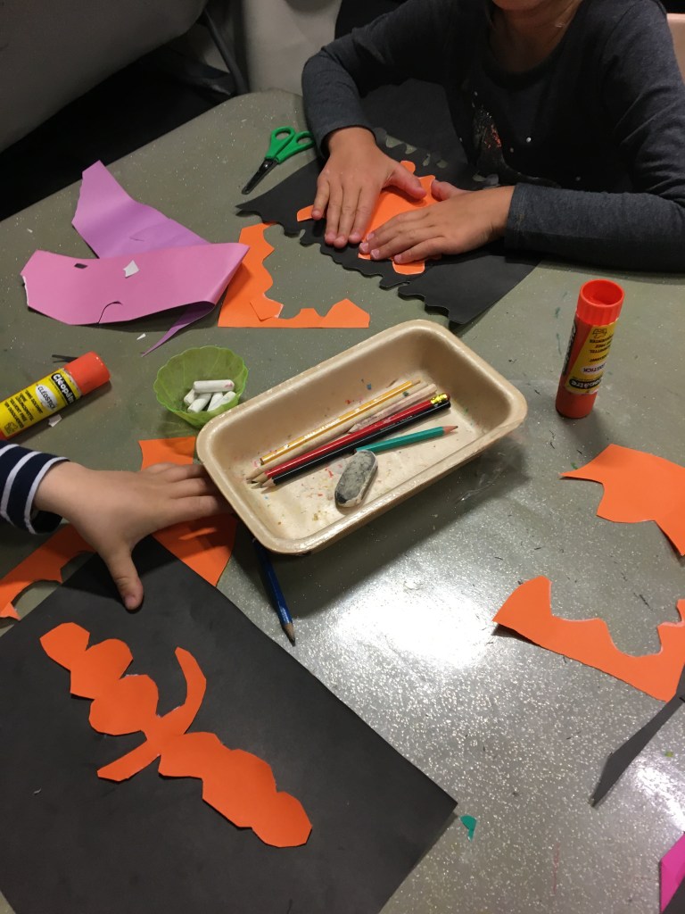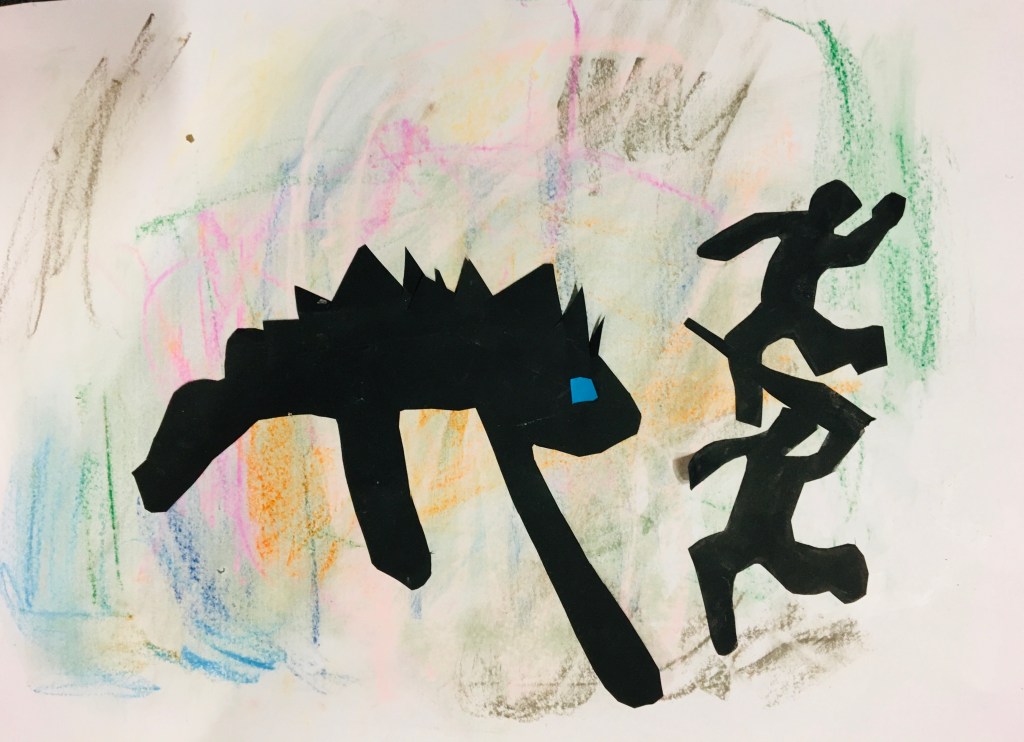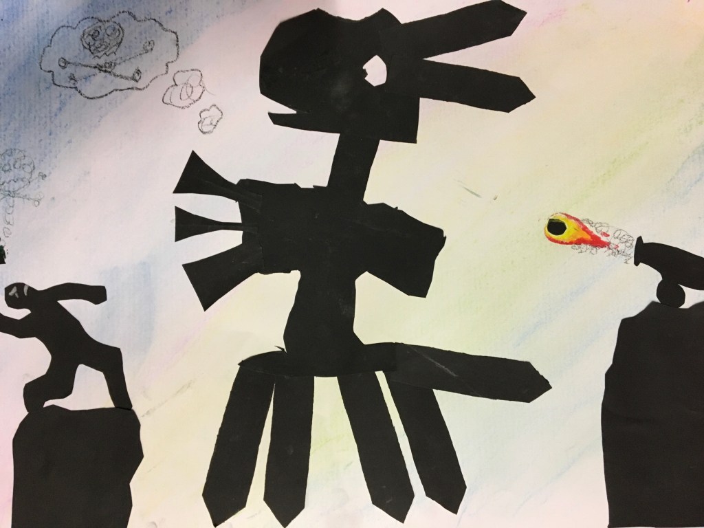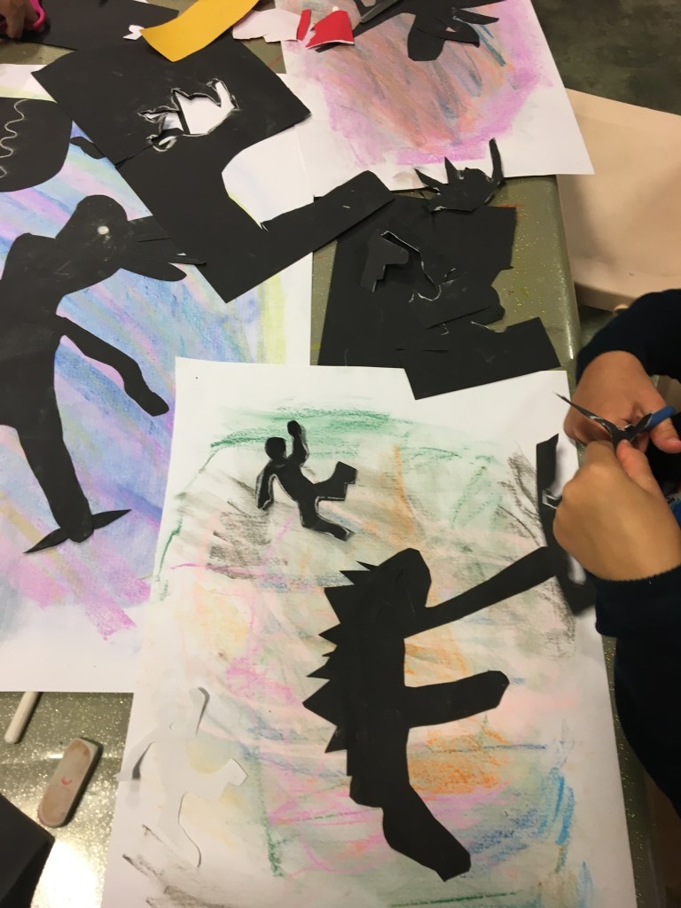 Des formes en couleurs (nos mains, des éléments glanés dans l’exposition au musée de Jean Labellie), des ombres et des lumières, des papiers récupérés, mis en volume (réalisation d’un pop-up), découpés avec une machine de découpe, des artistes connus ou moins connus (Matisse, Keith Haring, le dessinateur de BD Fred, l’art inuit, Michel Ocelot …)… une semaine riche en découvertes et créations.