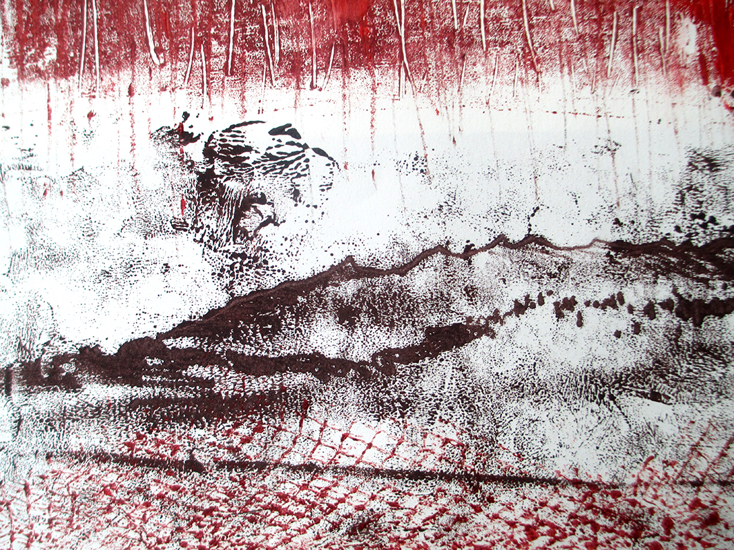 Le caractère éthéré de la technique employée, le monotype, confère à notre environnement urbain, familier et lisse, une atmosphère étrange, presque fantomatique, où la couleur rouge « circule », réminiscence d’un véhicule parfois présent, parfois à peine esquissé … l’ensemble de ces impressions raconte un voyage improbable, quasi immobile, entre réel et imaginaire.