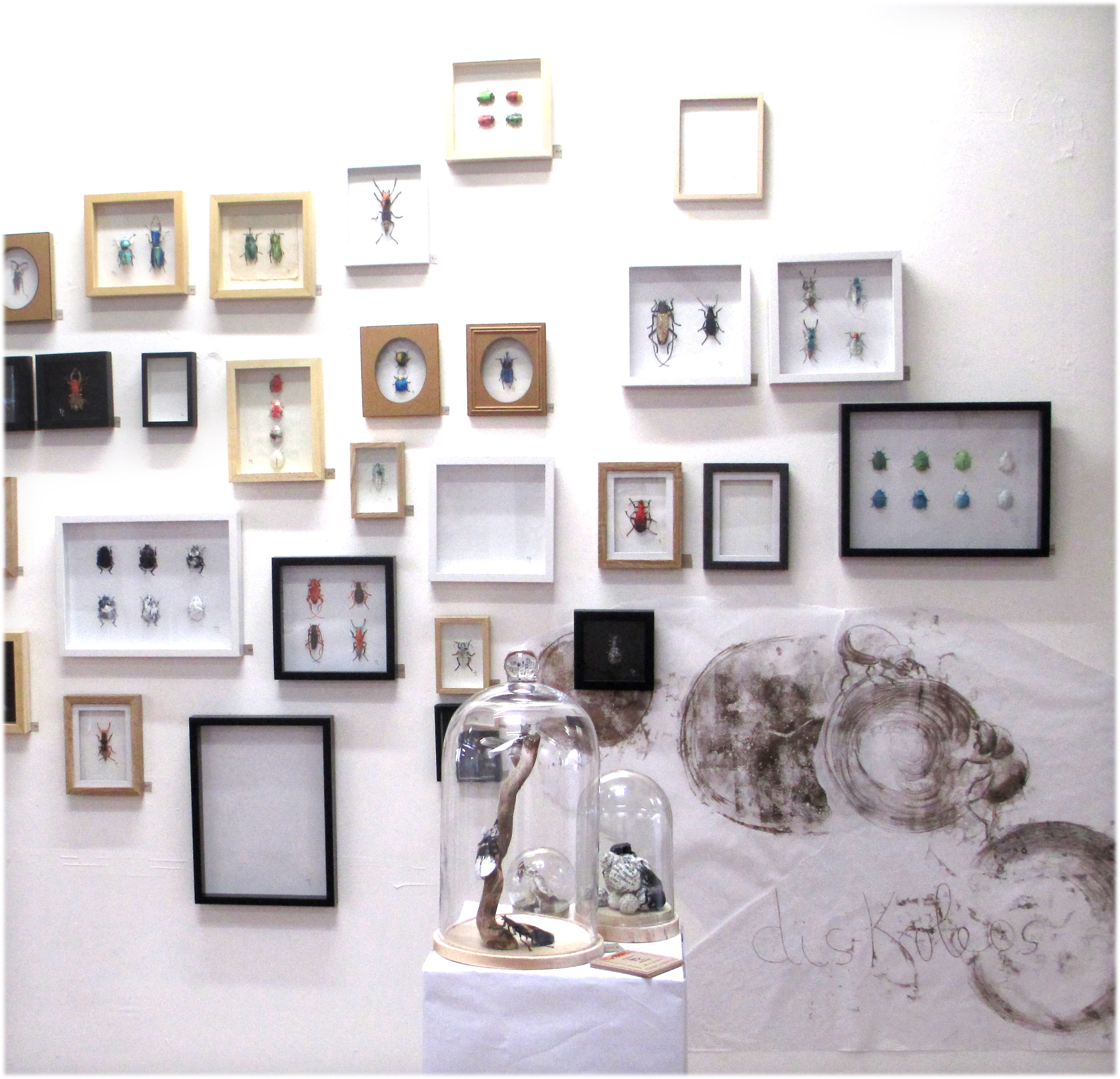 Titre de l’installation : « Dis-koleos », des coléoptères de papiers, brouillant les pistes entre naturel et artificiel, étonnement anecdotique et curiosité scientifique, pour lutter contre notre amnésie collective face à l’extinction massive des insectes.