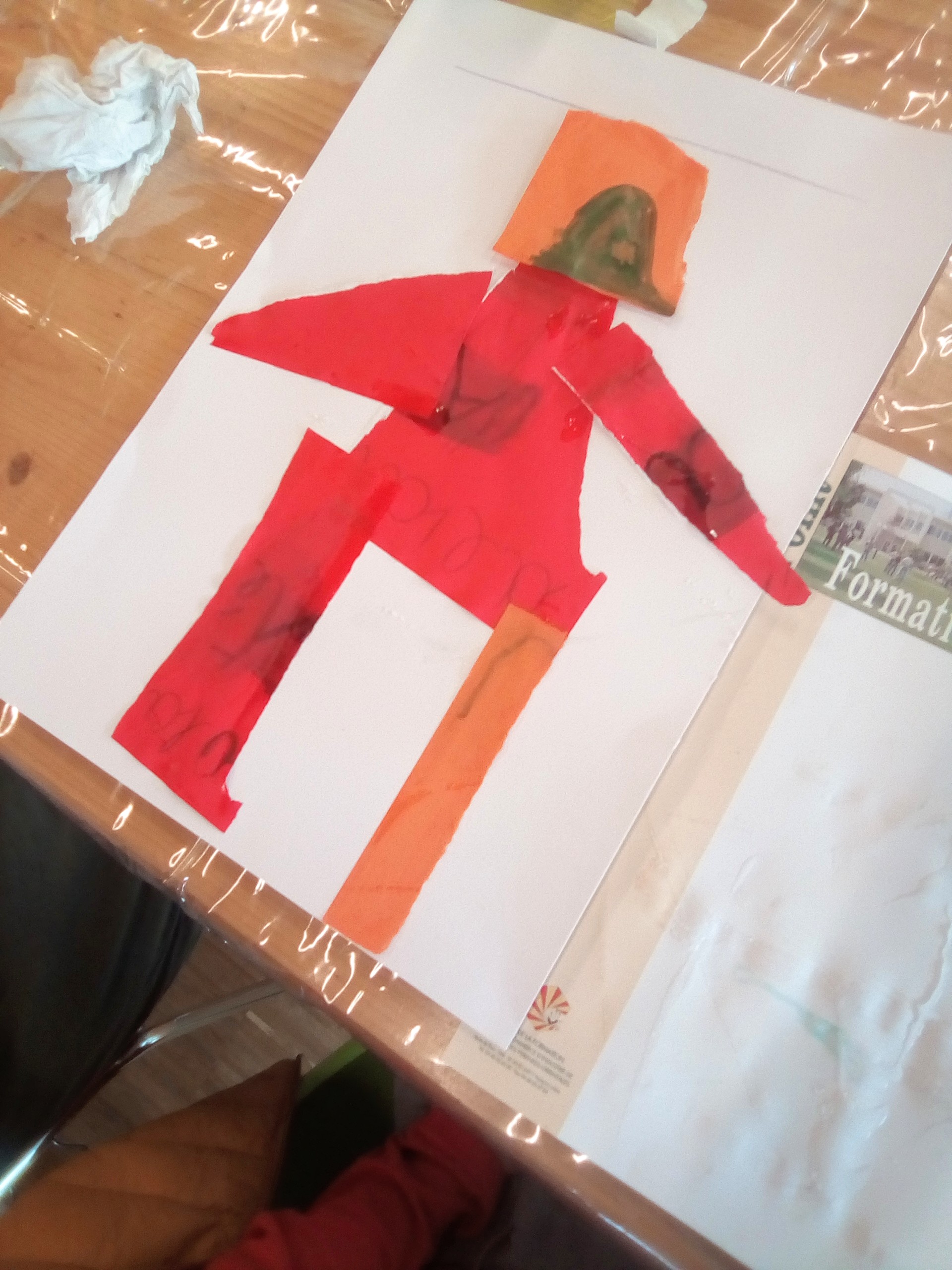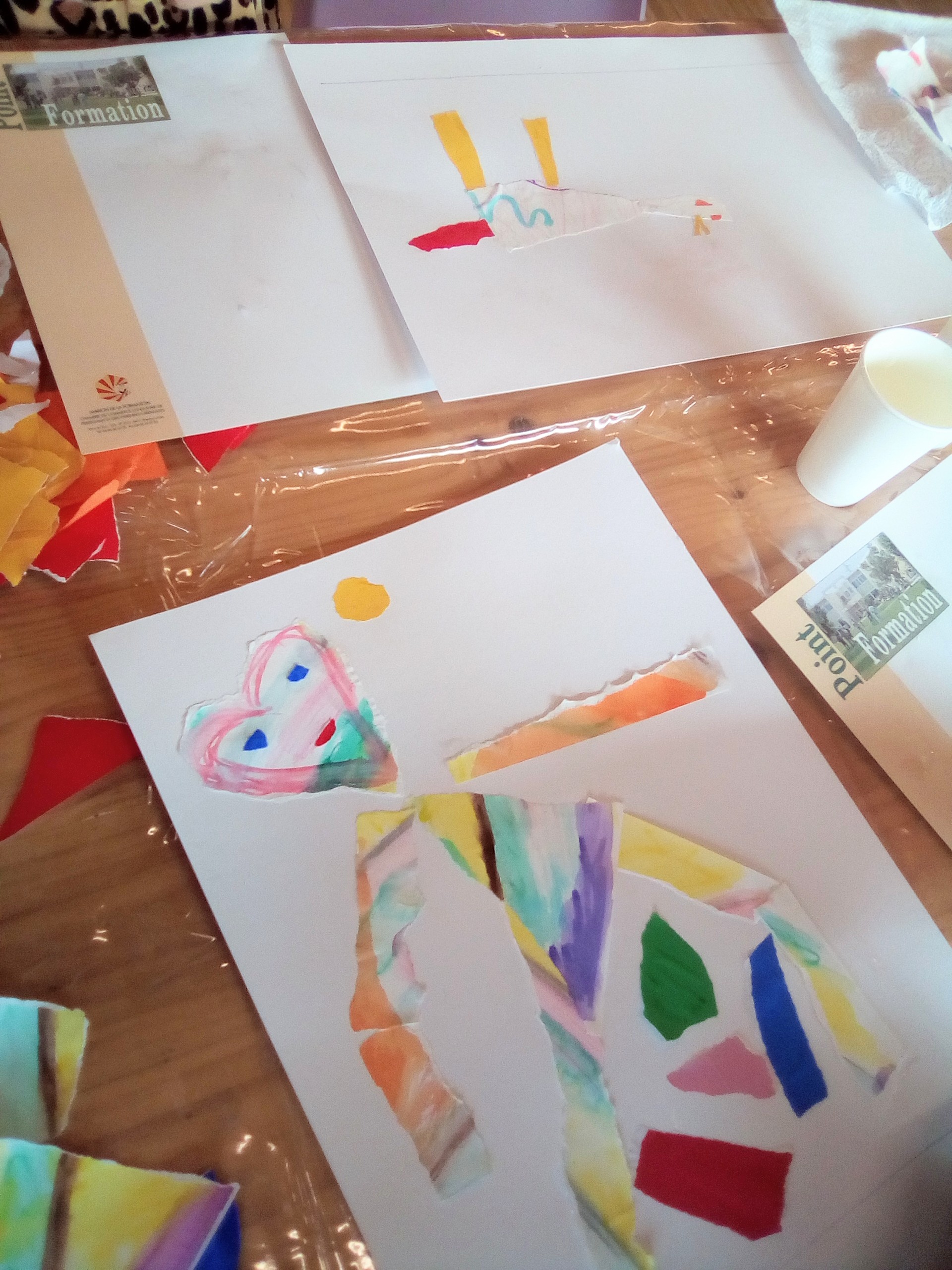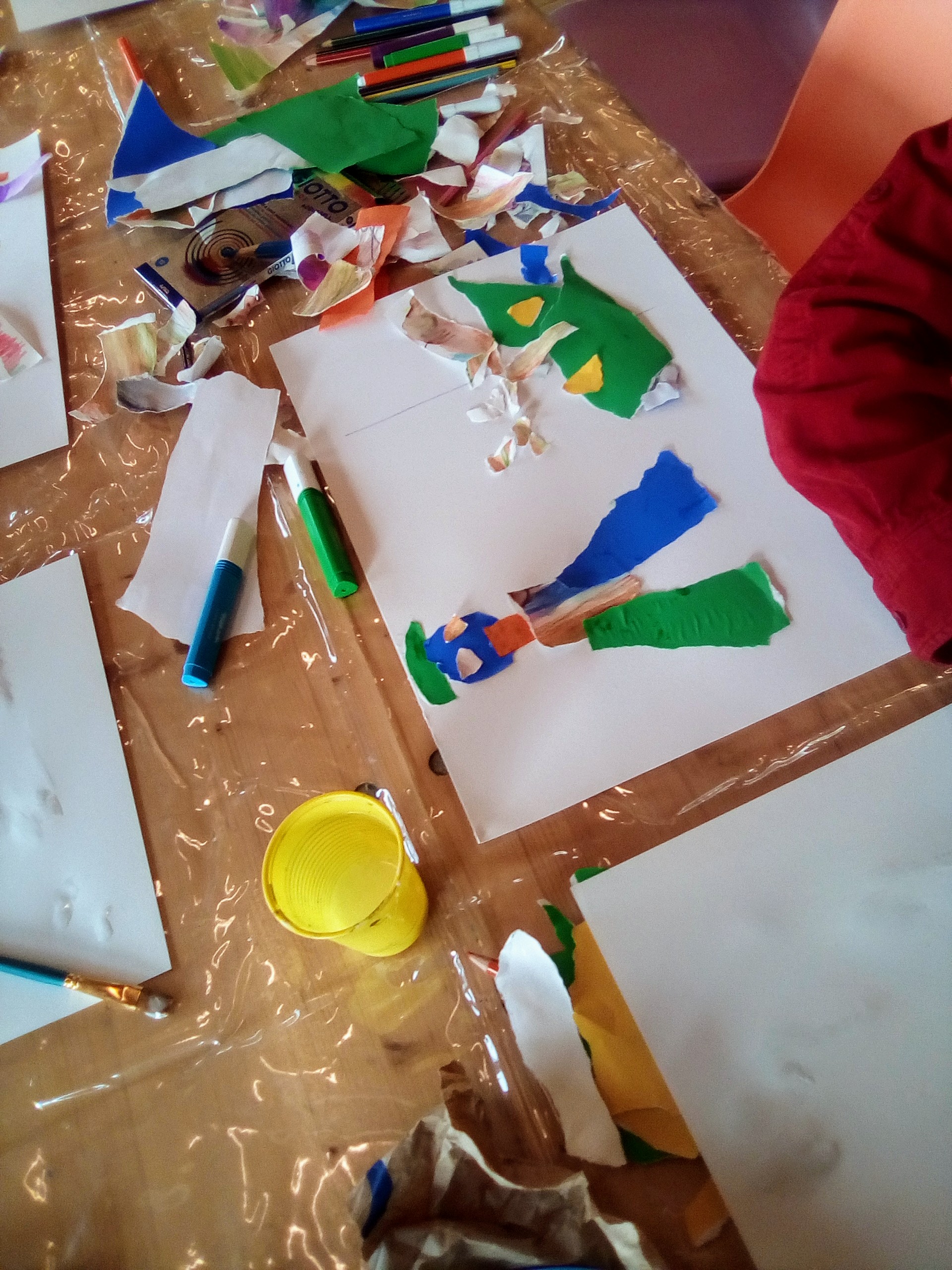 Les travaux en cours des élèves lors de l’atelier de mercredi 21 octobre : des pt’its papiers pour raconter. On déchire, on compose, on colle des pt’its papiers pour inventer un personnage, et écrire ses aventures…