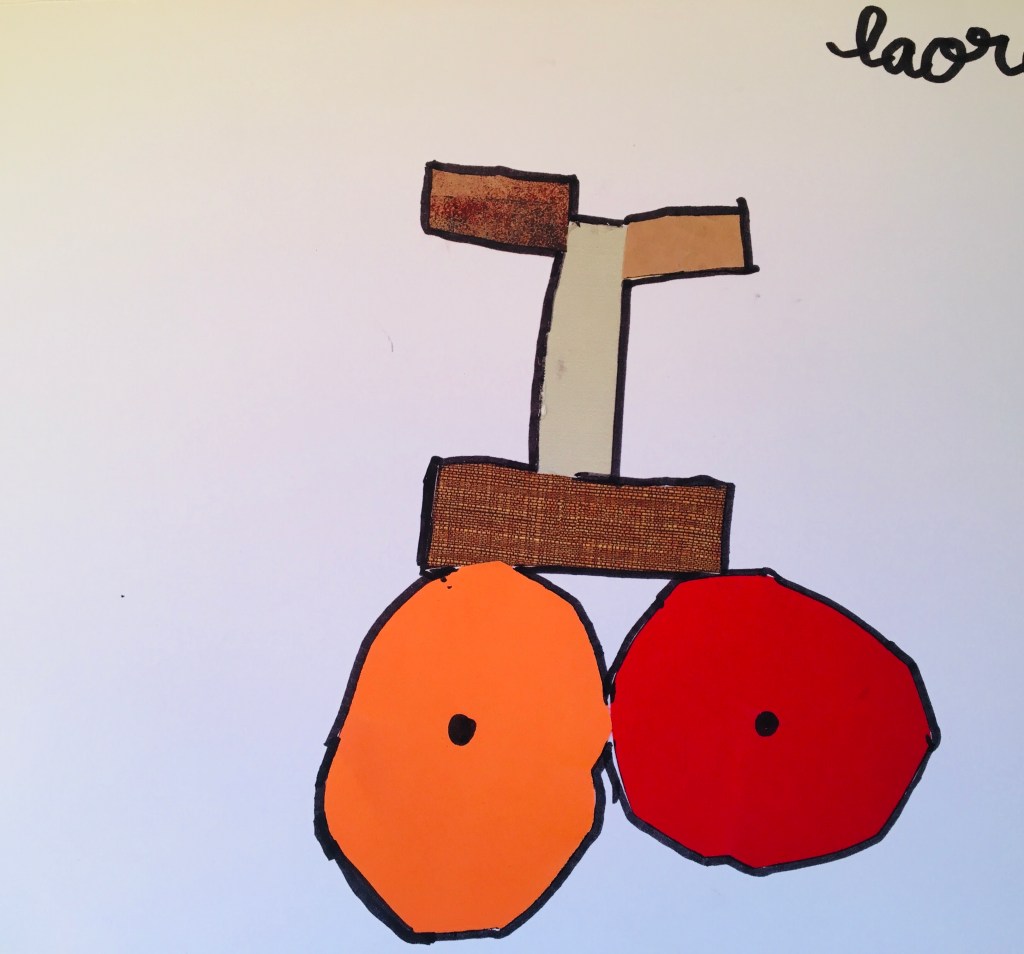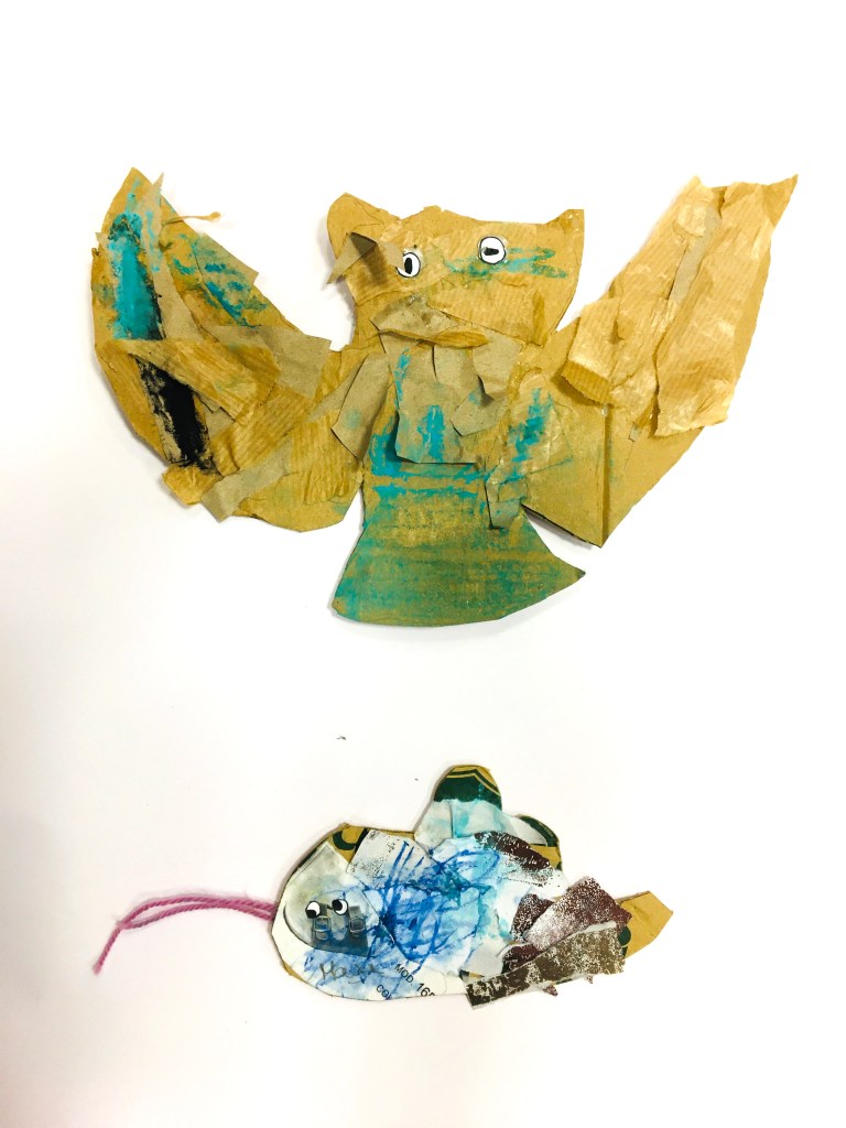 Avec les enfants des centres de loisirs, invention d’un album illustré, en s’inspirant de l’album « Une poupée de bric et de broc » (NM Serre, H Lacquement, éditions du Mont) : on imagine ce qui arrive aux petits personnages de carton et de « bric et de broc » que l’on a fabriqués, on crée les décors, les véhicules tout en papiers récupérés… on expérimente les techniques , encres, collage, dessin …