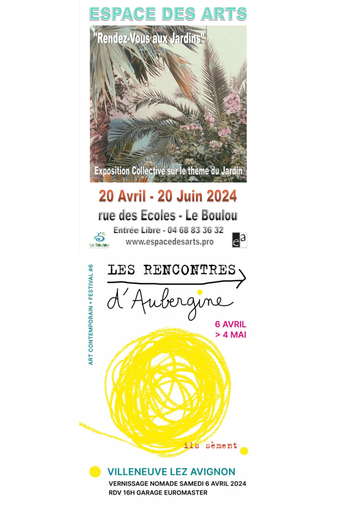 Dans les Pyrénées Orientales, au Boulou, exposition collective à partir du 20 avril à la galerie de l‘espace des arts sur le thème des jardins en compagnie de plusieurs artistes.