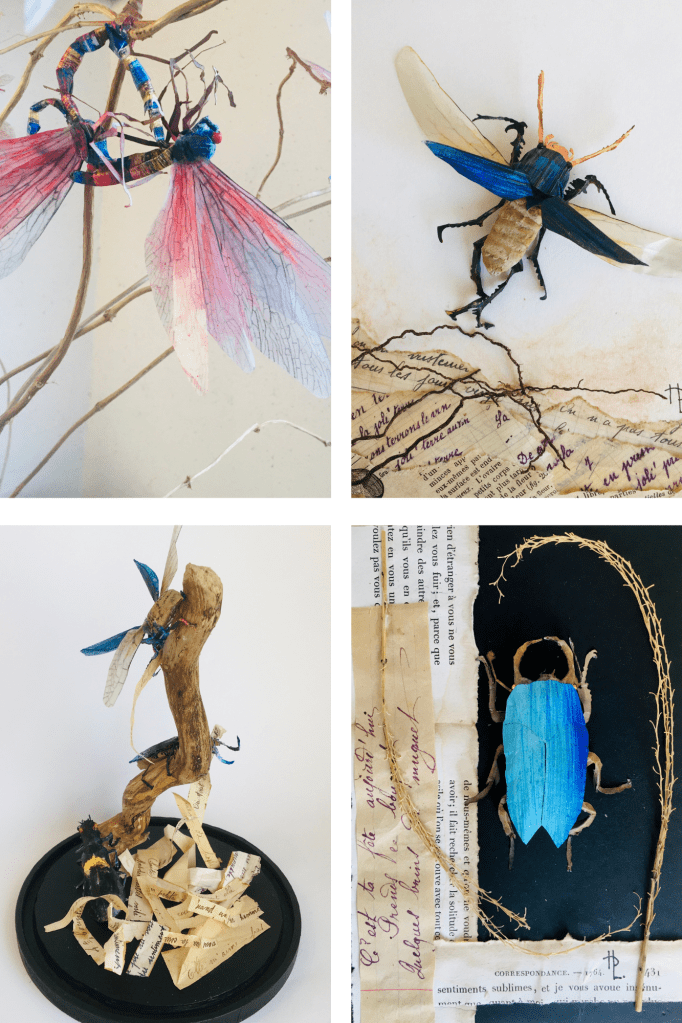 Ci-dessus, en haut à gauche, « baisers ailés » (détail), papiers, végétaux, techniques mixtes, verre, 100 x 75 x 45 cm. Vues supplémentaires, petits formats pour l’exposition « Ils sèment », papiers, végétaux, techniques mixtes.