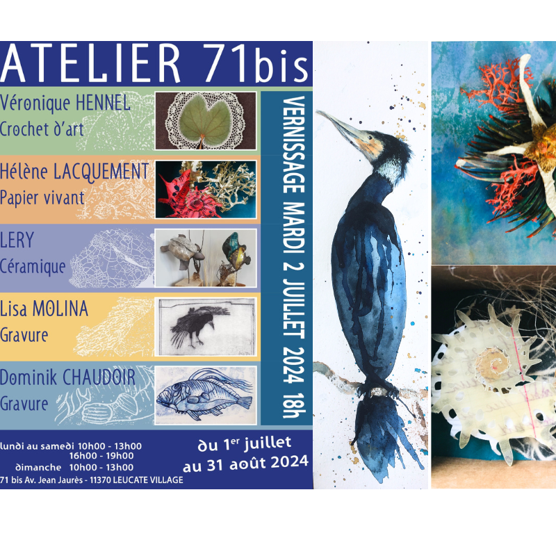 | Exposition au 71bis pour la 3e année consécutive à Leucate village pour l’été, avec Dominik Chaudoir (gravure), Lery (céramiques), Véronique Hennel (crochet d’art) et Lisa Molina (gravure). Venez nous rencontrer lors du vernissage mardi 2 juillet à partir de 18h. |