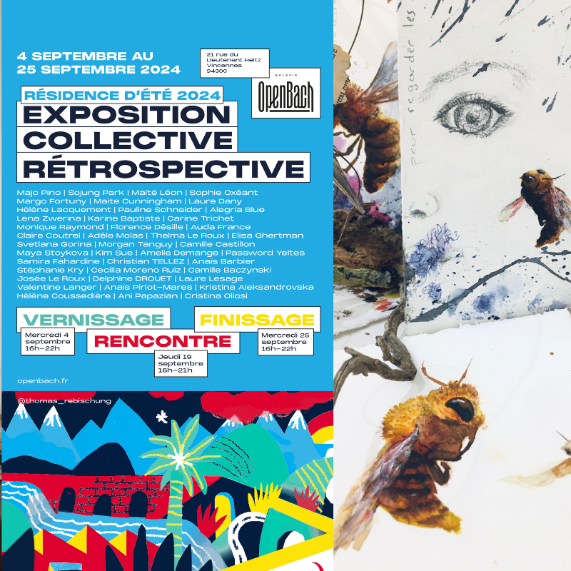 Suite à la résidence effectuée en juin 2024 à l’Open bach à Vincennes, une exposition collective de restitution aura lieu en septembre. Le fil rouge de la résidence était de collecter des souvenirs des habitants de Vincennes sur les insectes : répulsions, fascinations… l’aquarelle s’est progressivement associée aux papiers découpés et au dessin pour une restitution personnelle de ces témoignages. J’aurai le plaisir de présenter au public un aperçu de ces travaux en cours, lors du vernissage le 4 septembre.
