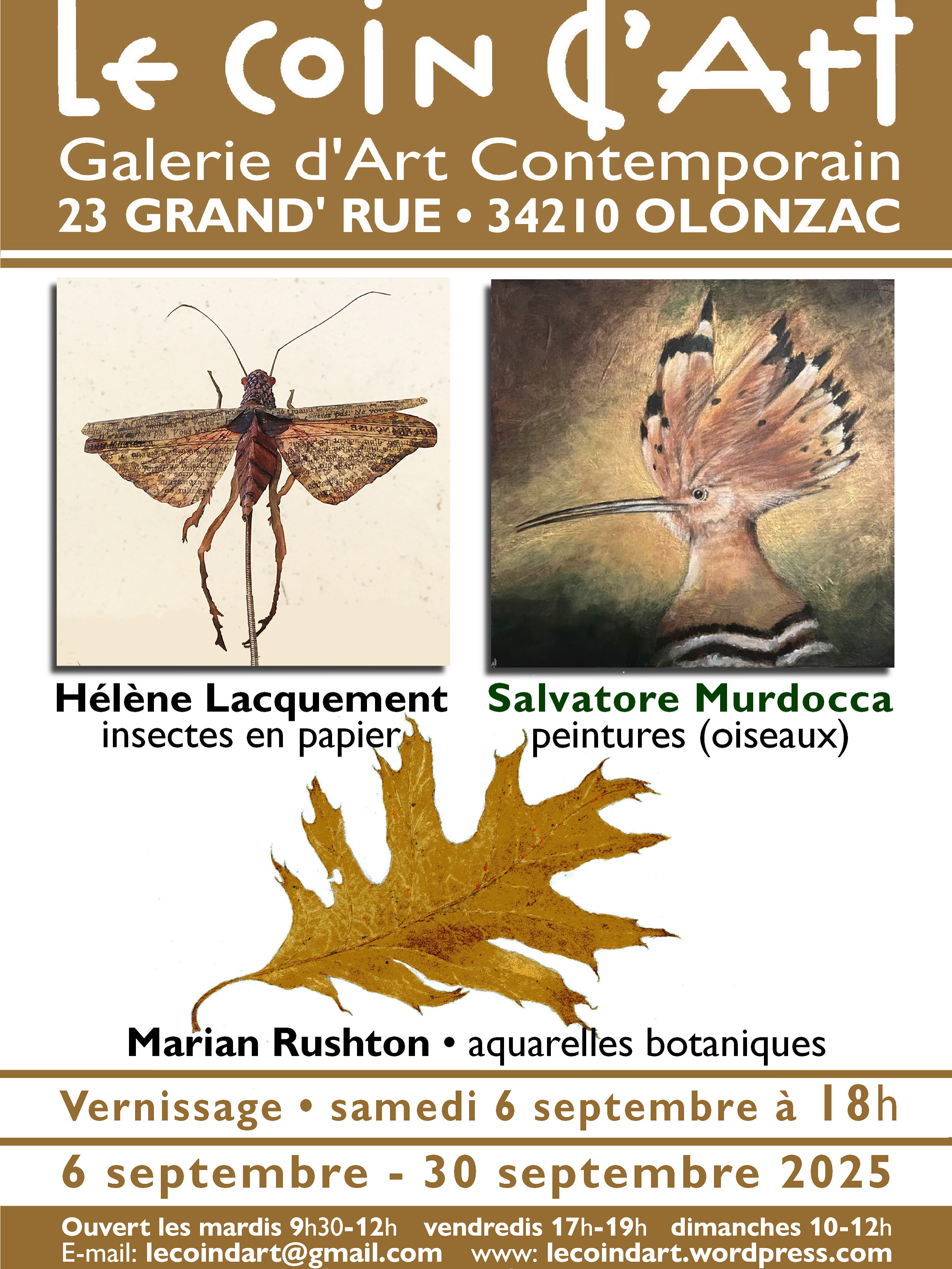 | J’ai le plaisir de vous inviter au vernissage de mon exposition de curiosités de papiers, qui se tiendra à la galerie Le coin d’art à Olonzac dans l’Hérault, avec les artistes Salvatore Murdocca et Marian Rushton. Ce sera une belle occasion de découvrir mon univers artistique et d’échanger autour de l’art du papier. Je serai ravie de vous compter parmi nous pour partager un moment convivial le samedi 6 septembre à partir de 18h. |
