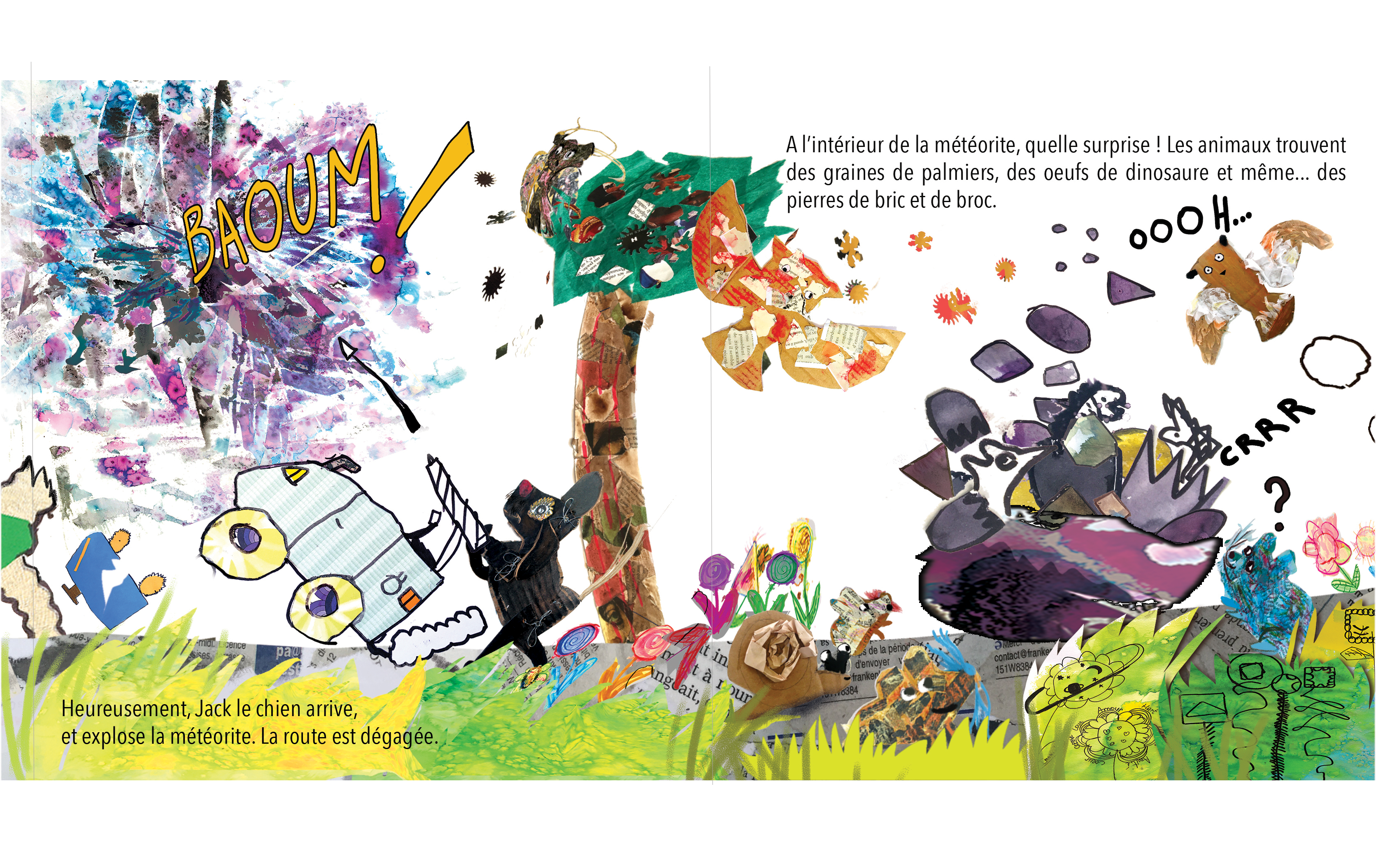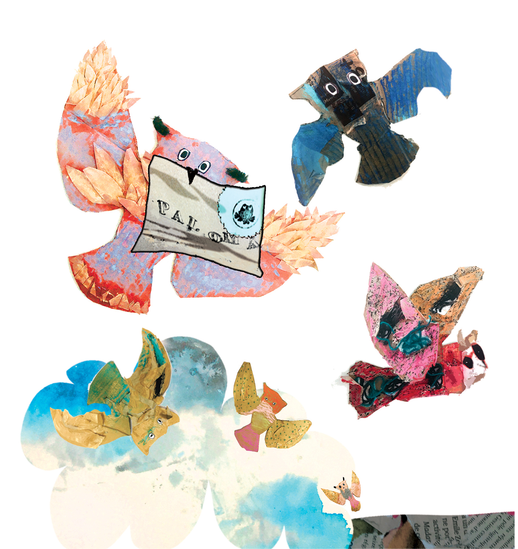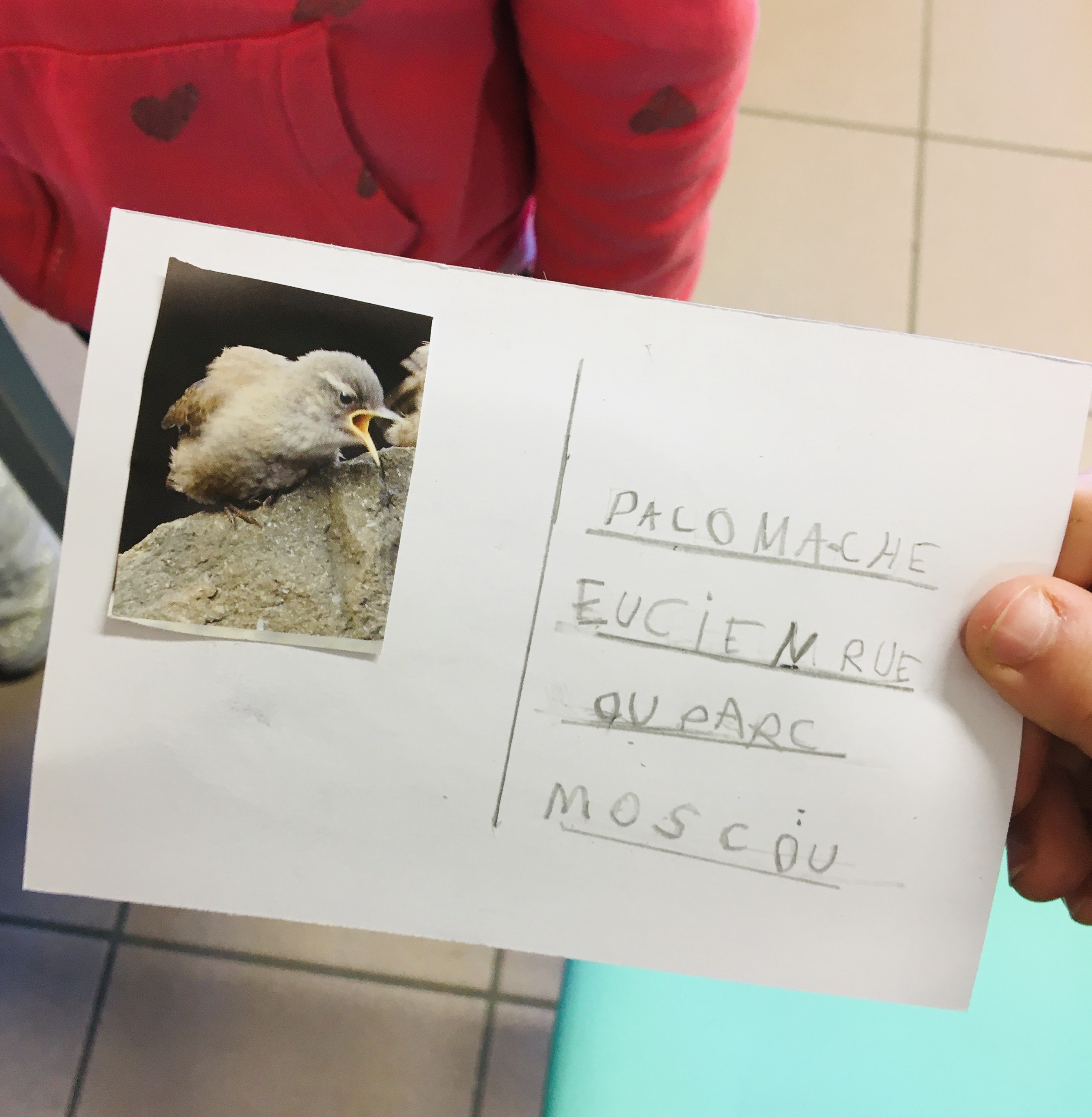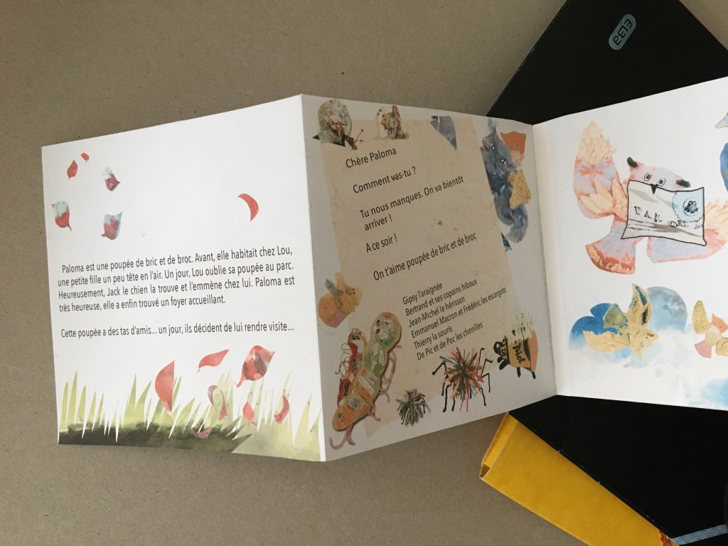 Avec les enfants des centres de loisirs, création d’un album illustré, en s’inspirant de l’album « Une poupée de bric et de broc » (NM Serre, H Lacquement, éditions du Mont) sur le thème de la correspondance : on imagine ce qui arrive aux petits personnages de carton et de « bric et de broc » que l’on a fabriqués, on crée les décors, les véhicules tout en papiers récupérés… on expérimente les techniques , encres, collage, on invente des timbres et des cartes imaginaires…