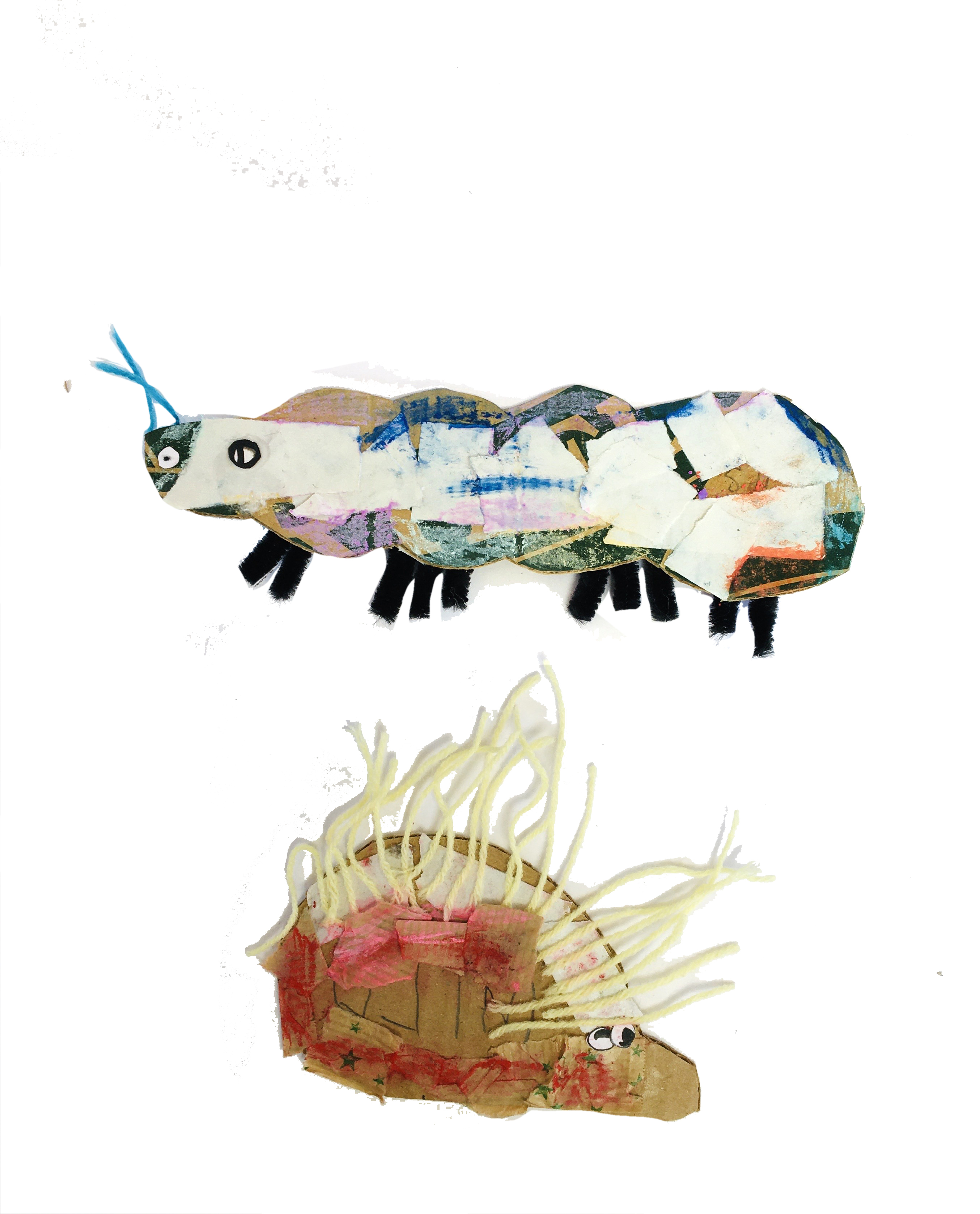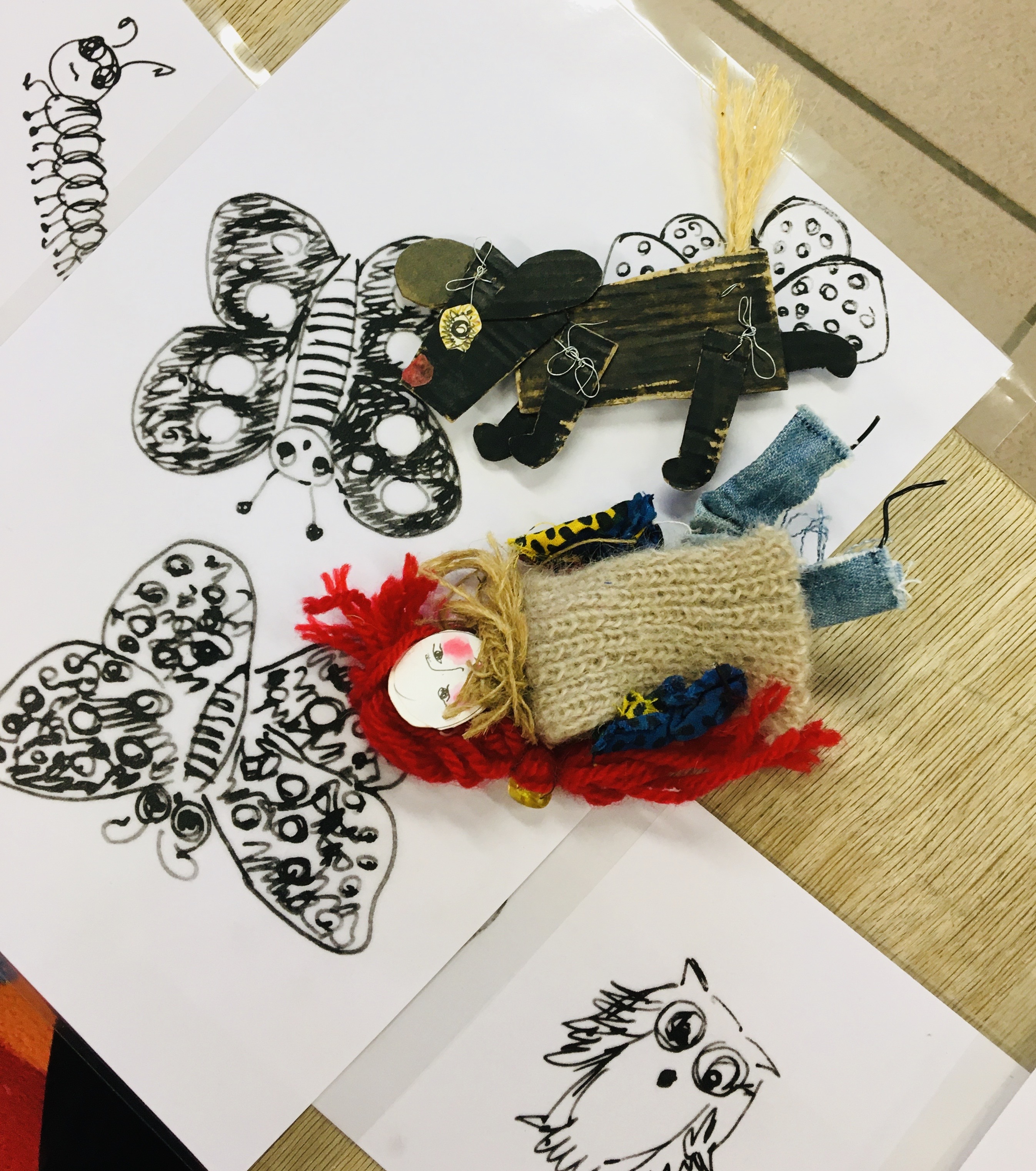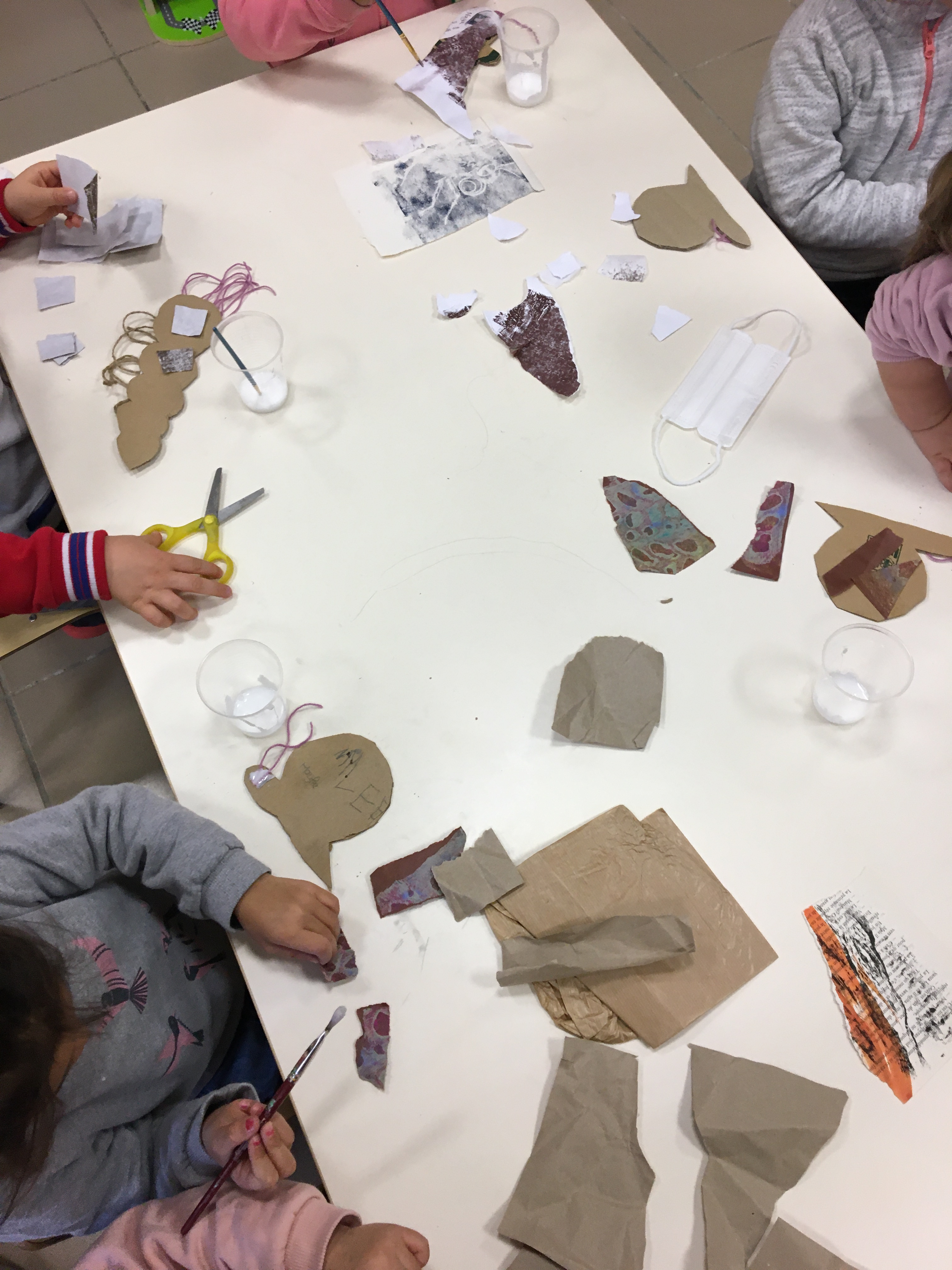 Avec les enfants des centres de loisirs, création d’un album illustré, en s’inspirant de l’album « Une poupée de bric et de broc » (NM Serre, H Lacquement, éditions du Mont) sur le thème de la correspondance : on imagine ce qui arrive aux petits personnages de carton et de « bric et de broc » que l’on a fabriqués, on crée les décors, les véhicules tout en papiers récupérés… on expérimente les techniques , encres, collage, on invente des timbres et des cartes imaginaires…