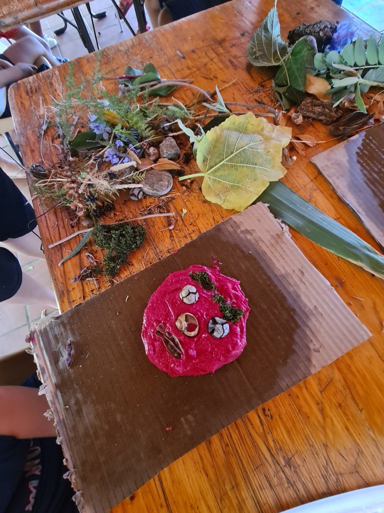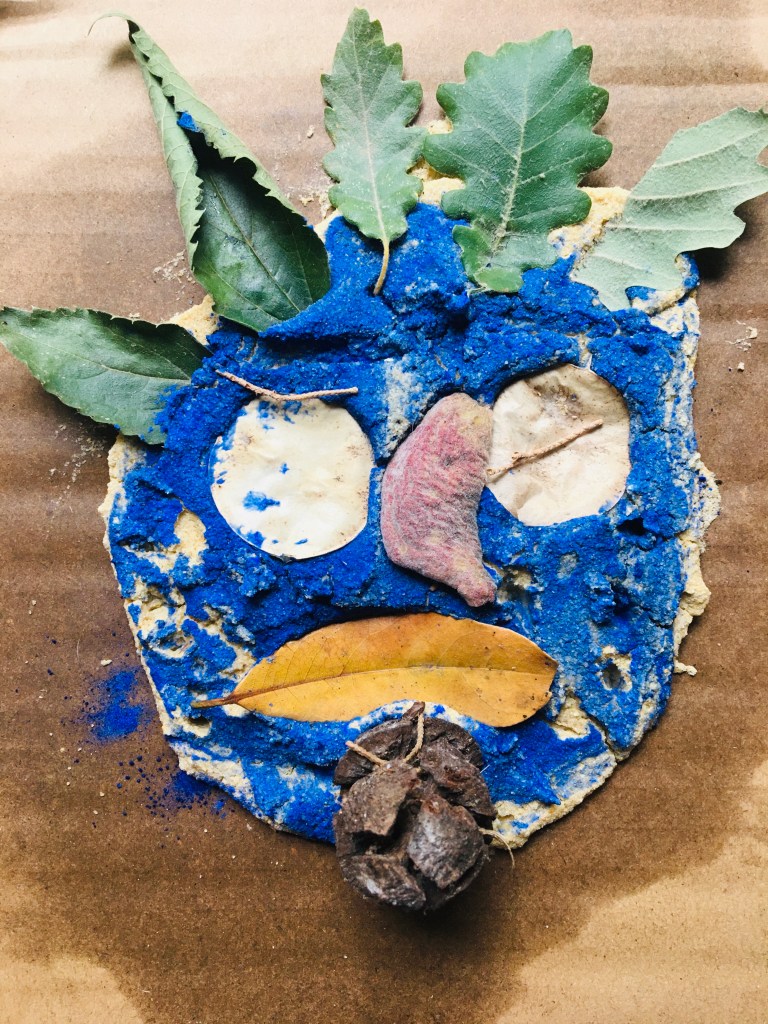 Après une petite balade le long du ruisseau, création de figures imaginaires à partir de notre récolte de matériaux végétaux, pierres, plumes … l’assemblage se fait sur une couche de liant en sable, colle d’amidon et pigments colorés.