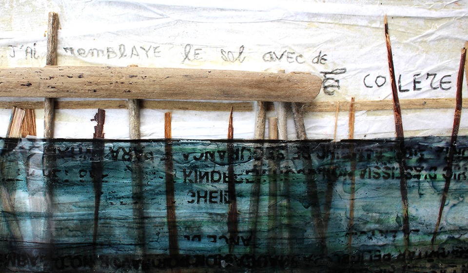 Ce sont ces paroles qui m’ont servi de point de départ. La construction d’un long ponton menant au cimetière envahi par les eaux a été également une image-clé. J’ai tenté de réinventer ce paysage à travers le filtre de certaines oppositions : l’écriture discrète des confessions poignantes des villageois de Java, à peine visibles car souvent inaudibles à nos oreilles, qui s’oppose aux slogans agressifs inscrits sur des sachets plastiques ; les textures mates et brutes du papier blanc et des matériaux naturels, contrastant avec l’aspect brillant, envahissant, d’une mer de plastique bleuâtre.