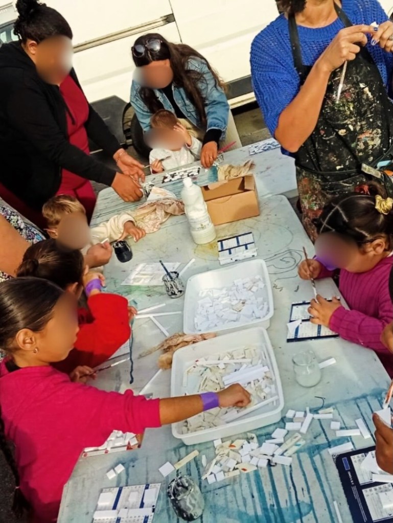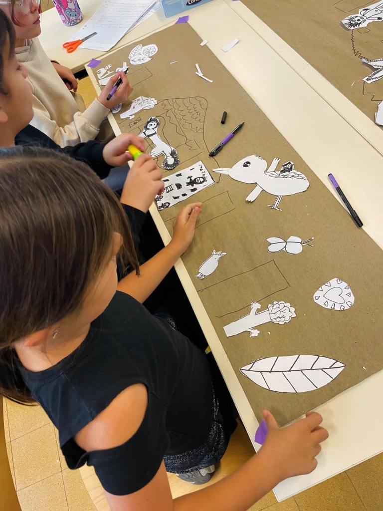 Les élèves des deux écoles ont pu travailler ensemble sur des temps artistiques communs à l’école, mais aussi en dehors puisqu’avec la Capsule de création d’Agit’Hé les artistes se sont rendus dans le quartier du Nouveau Logis pour proposer aux parents de participer avec les enfants, hors temps scolaire.