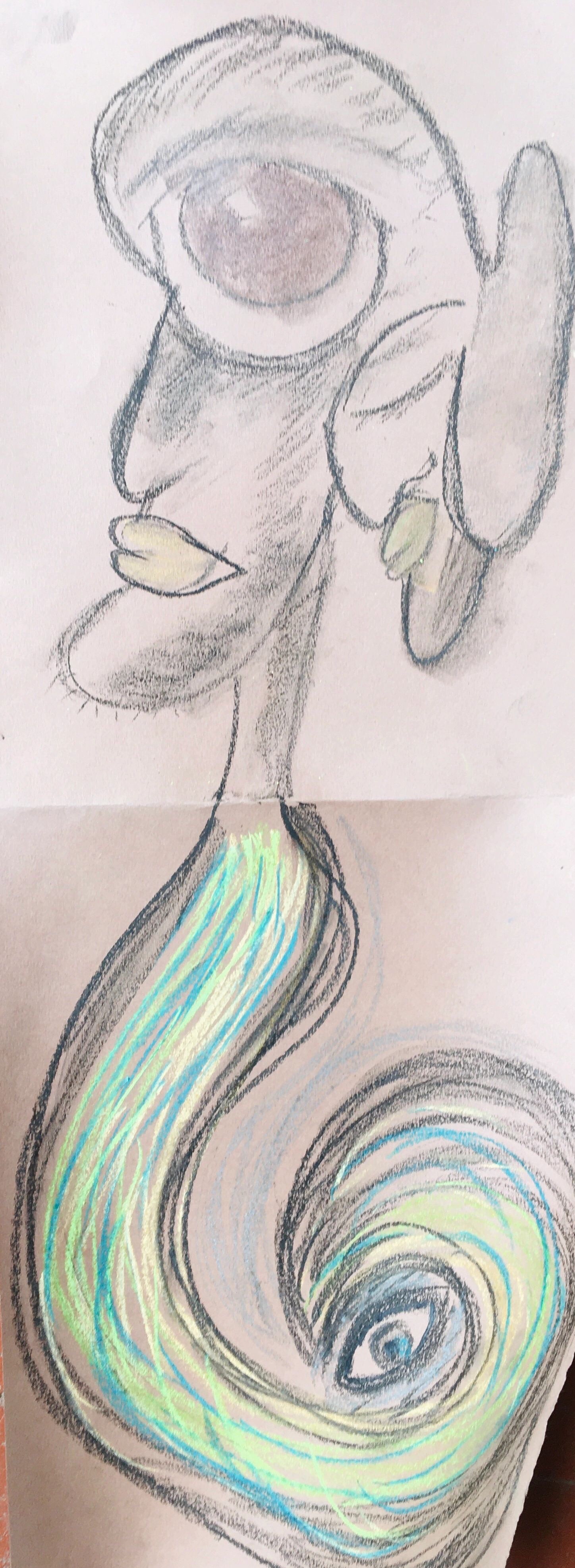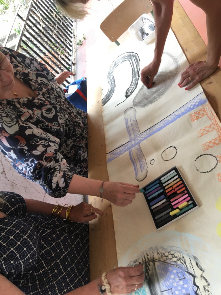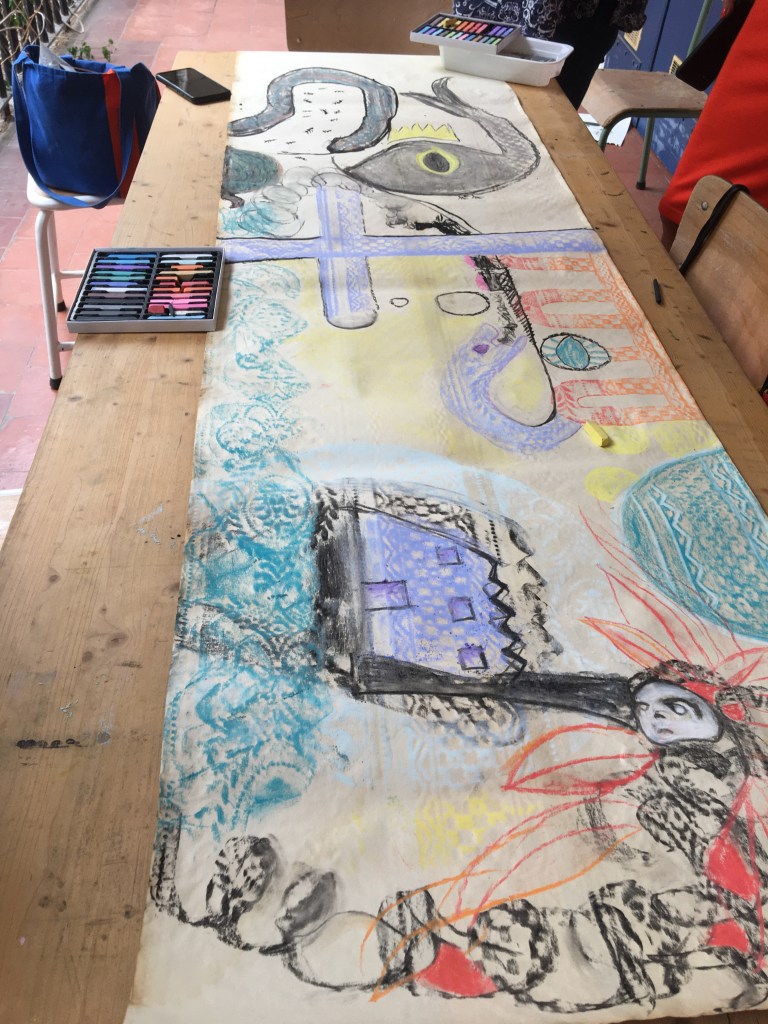 Atelier autour du cadavre exquis, dans le cadre de l’exposition Front de mer, autour des surréalistes sur la côte Vermeille dans les années 40, Musée d’Art Moderne de Collioure (juillet 2023).