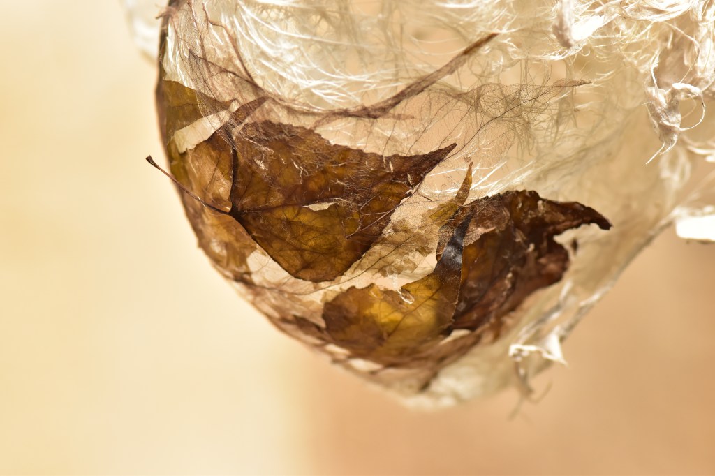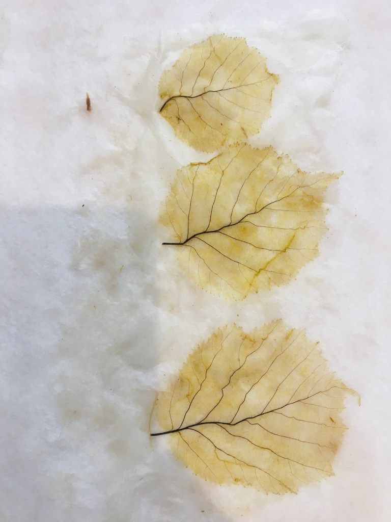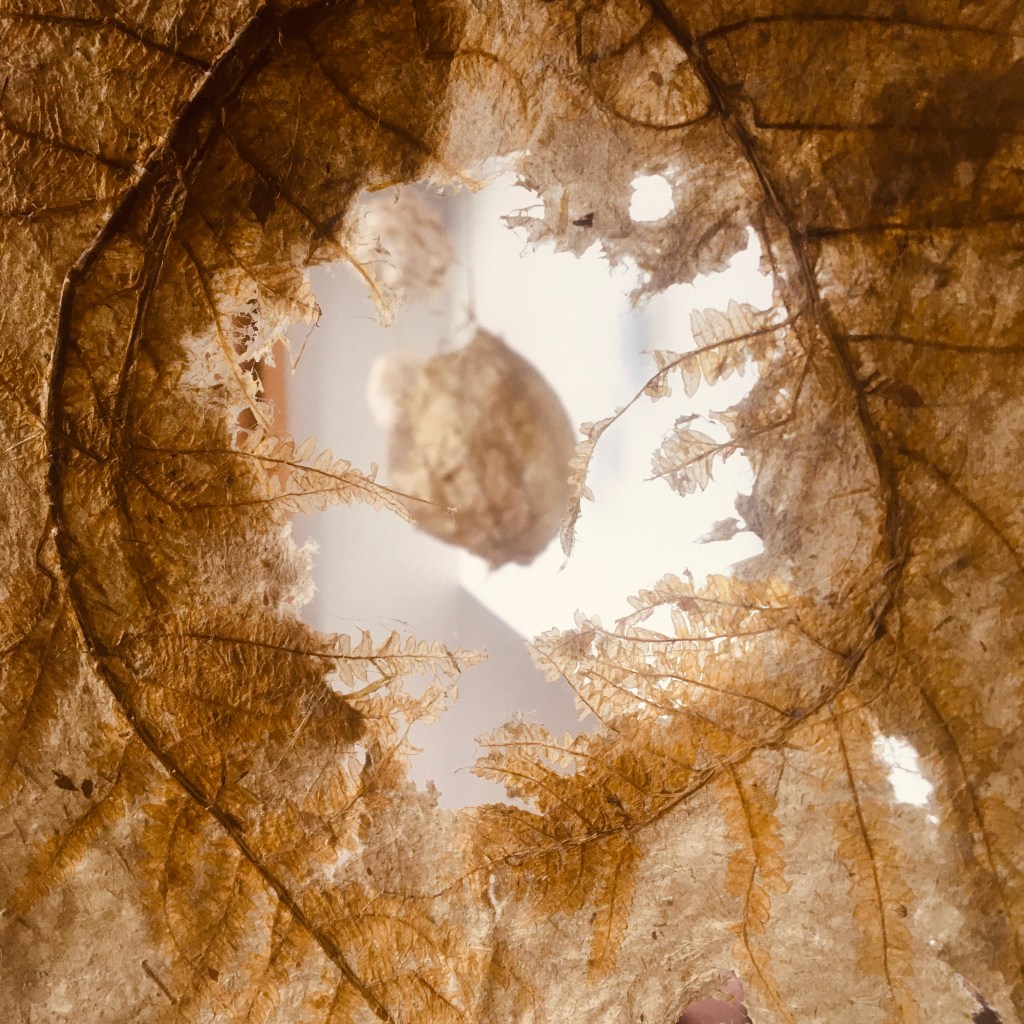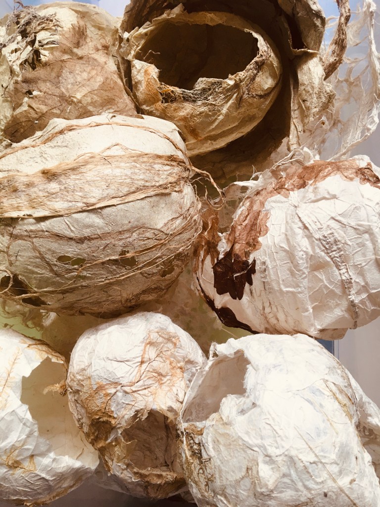 De formation scientifique, l’artiste a installé un mini « atelier-laboratoire » au Moulin lui permettant de réaliser des essais d’extraction de fibres à partir des tiges, des feuilles d’arbres que l’on trouve au Moulin, au moyen de cueillettes raisonnées, et de méthodes d’extraction physico-chimiques respectueuses de l’environnement.