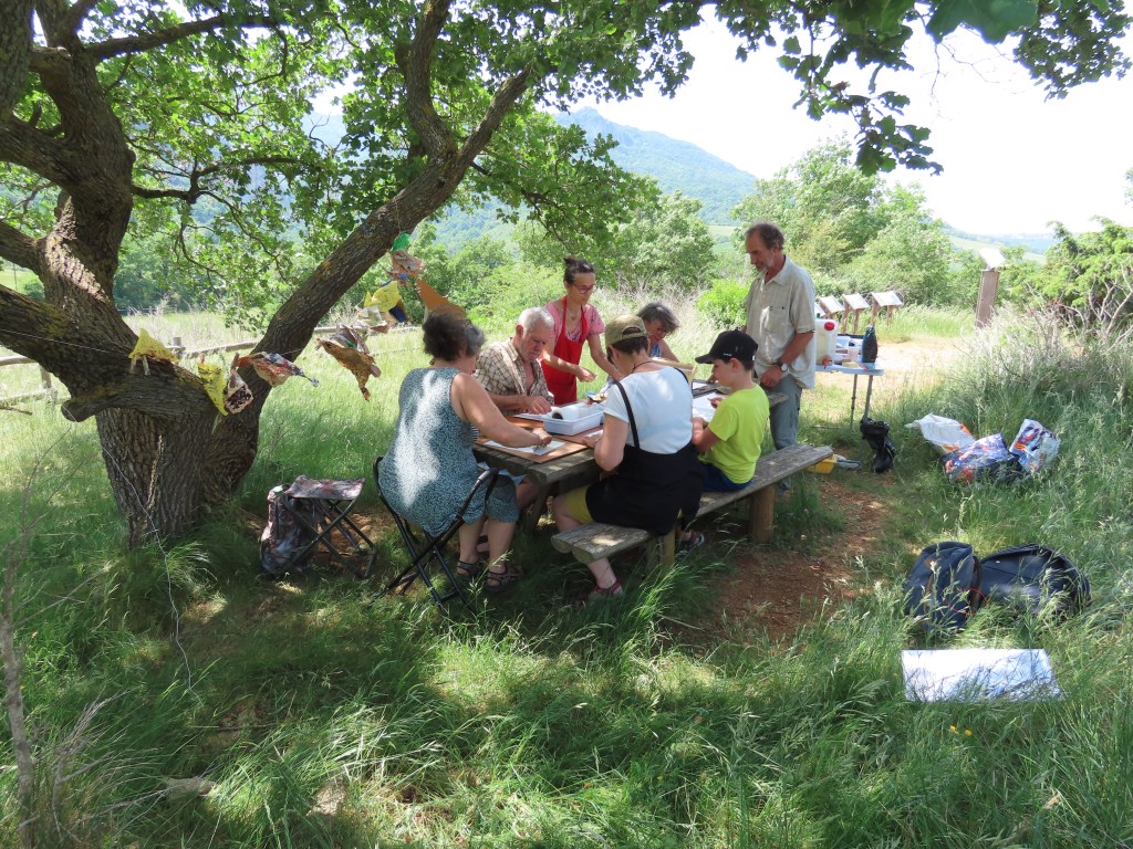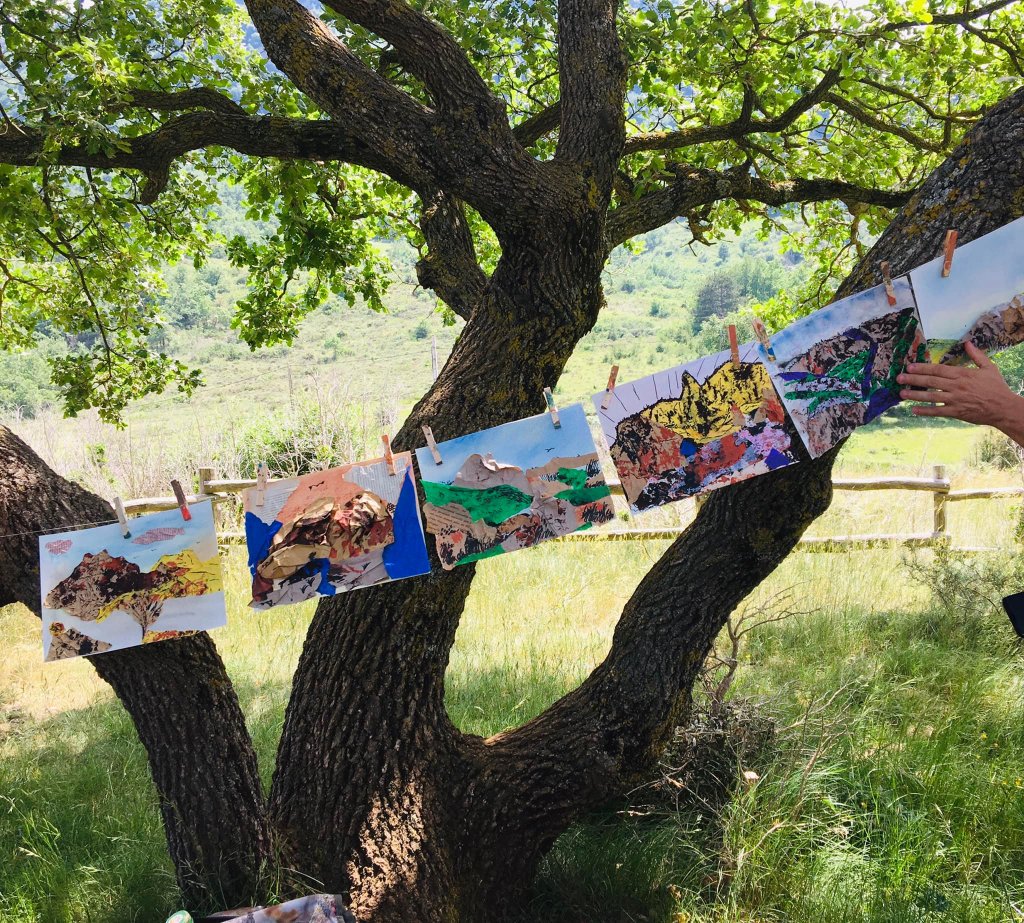 Atelier plein air au parc régional de la Narbonnaise, découpages et collages, au Bugarach.