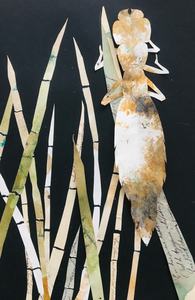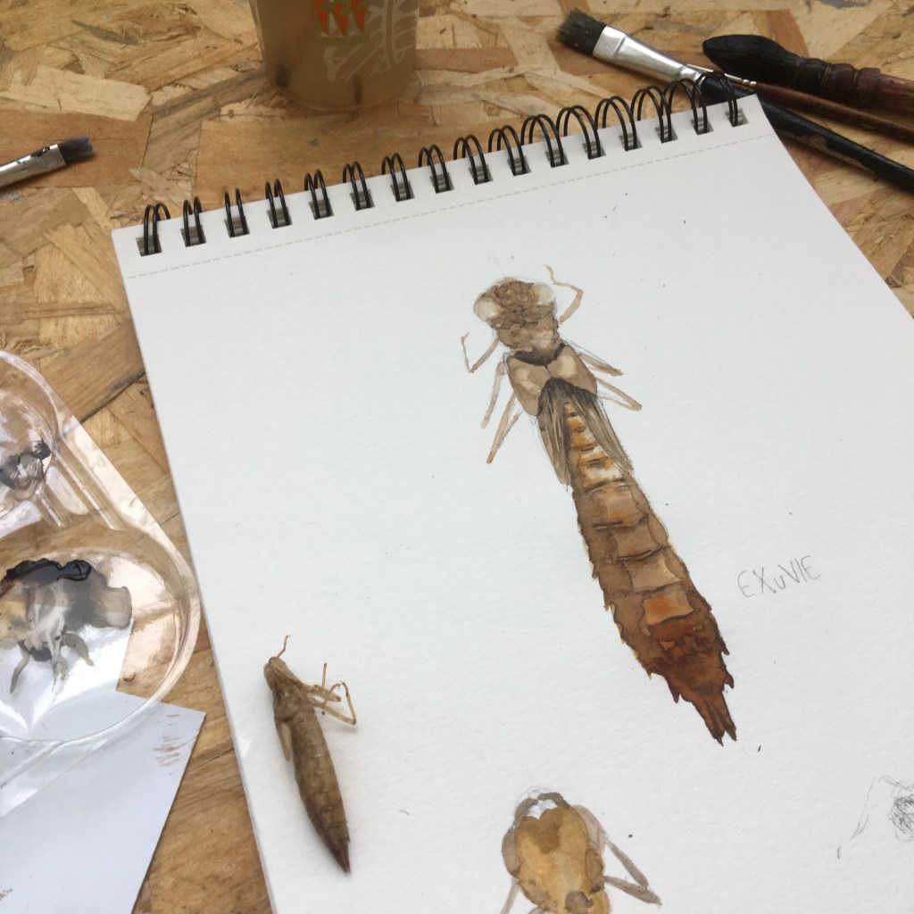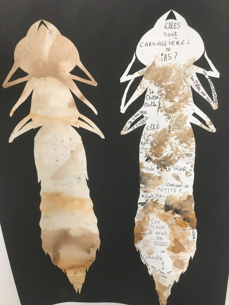 Photos des odonates observées lors de la sortie, collages, aquarelles, juin 2024