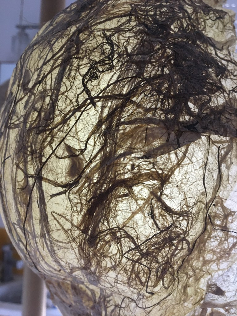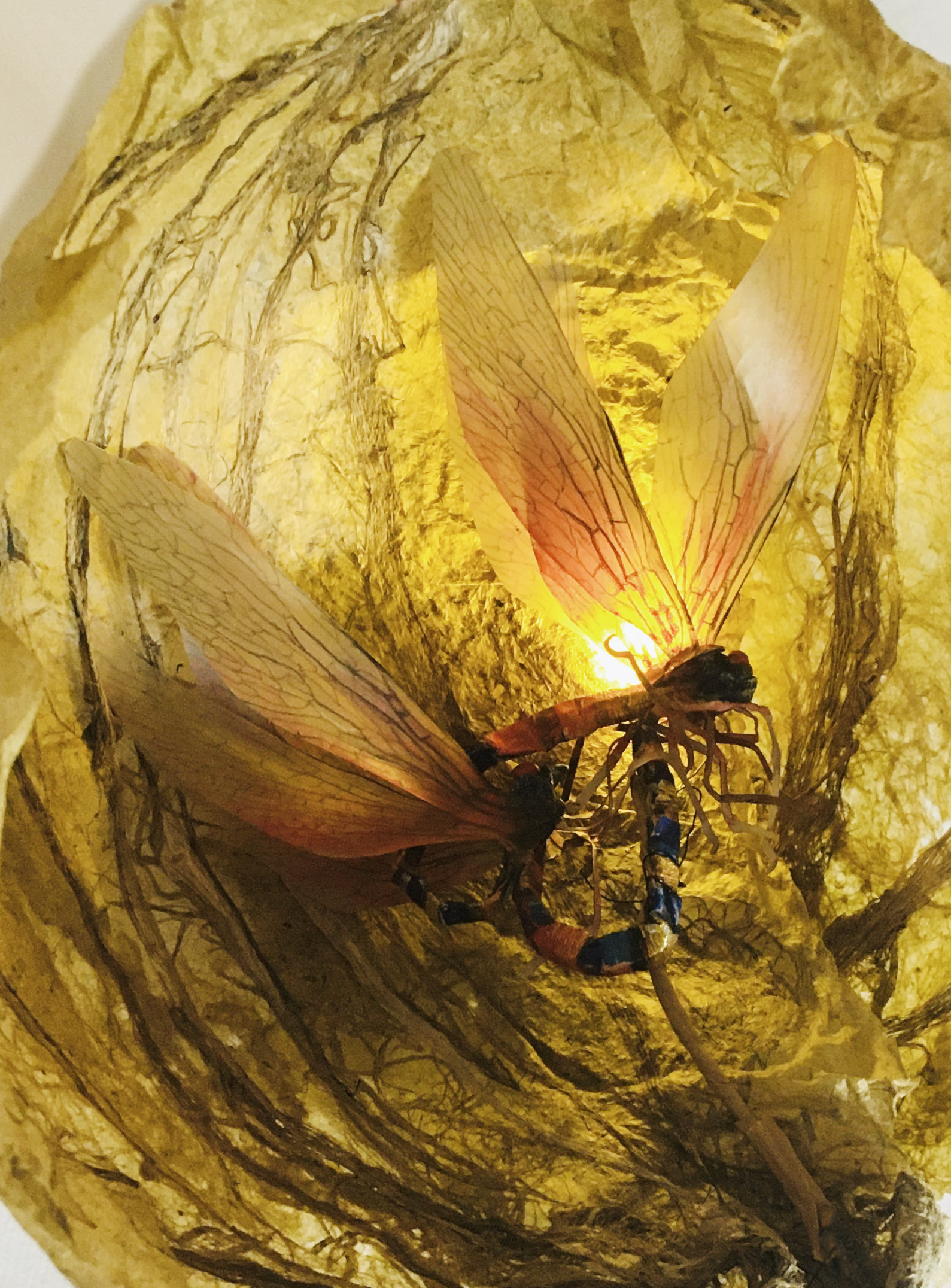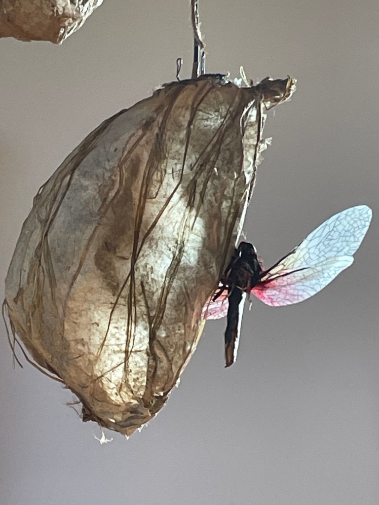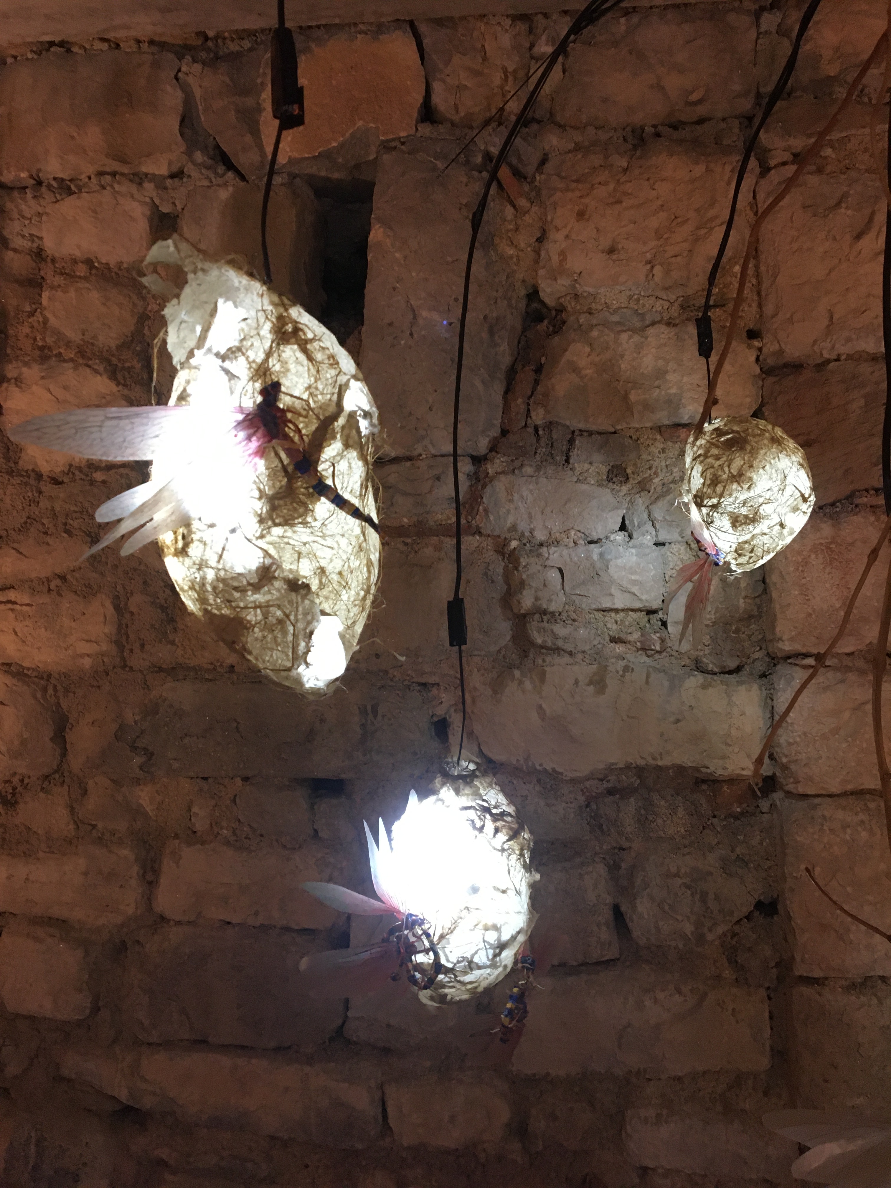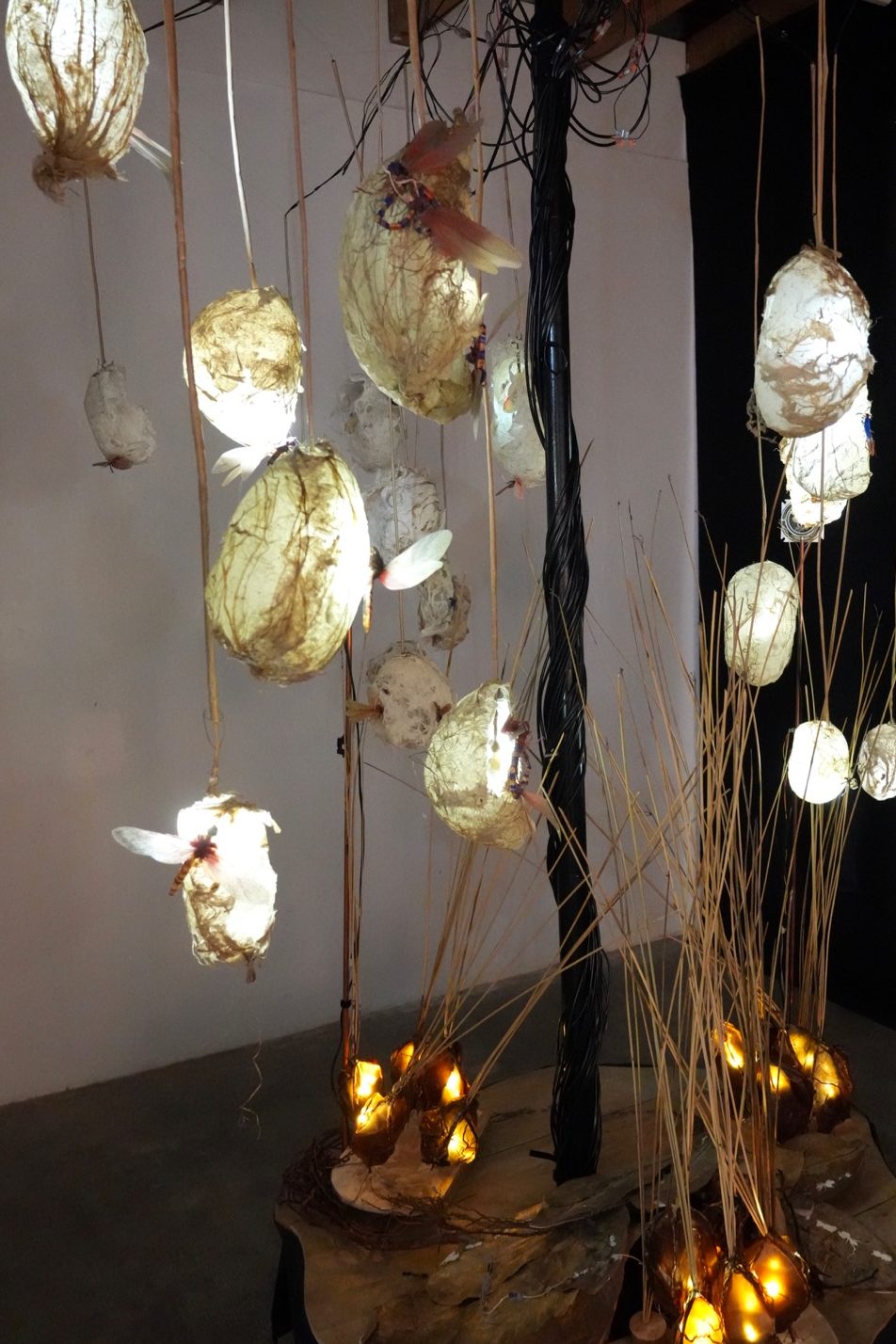 Avec le projet Sensilles, l’artiste souhaite questionner les relations que l’humain entretient avec les insectes, en intégrant une dimension participative à ses créations. Au-delà de nos répulsions ou de nos fascinations, des souvenirs émerveillés de notre enfance, est-il possible d’interagir avec ce monde étrange ? Chez les insectes, les fonctions tactiles, gustatives ou olfactives sont portées par des organes sensoriels appelés sensilles. Les humains, eux, entrent en relation avec le monde extérieur par leurs cinq sens. Une première proposition d’installation participative, interactive, sonore et lumineuse a vu le jour, exposée en octobre dernier à la galerie d’art contemporain à cent mètres du centre du monde à Perpignan dans le cadre du festival R-cas. Des insectes de papiers colorés bourdonnent et s’activent autour de « cocons » de papiers végétaux, suspendus à des excroissances lumineuses qui semblent être régulées par des lois mystérieuses mais stables. Le visiteur humain s’approche tout près de ces structures ; les bruissements s’interrompent, les cocons ne s’illuminent plus harmonieusement… et l’on entend des voix humaines qui nous racontent leur histoire vécue avec un insecte. Au pied de ces modules, des structures ovoïdes translucides et lumineuses apparemment immobiles ont germé…