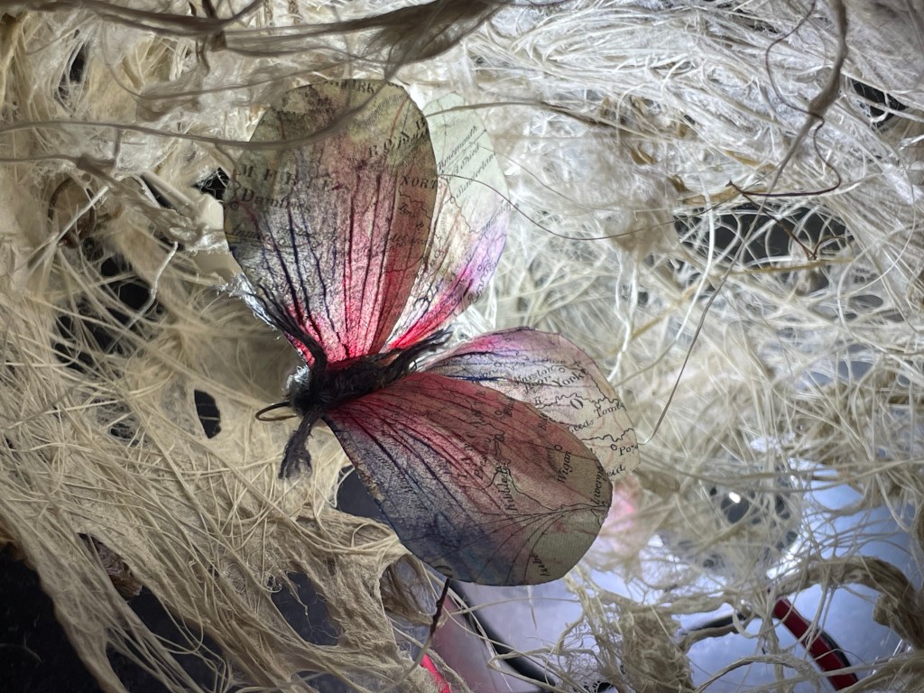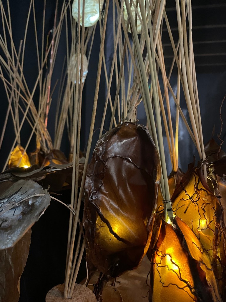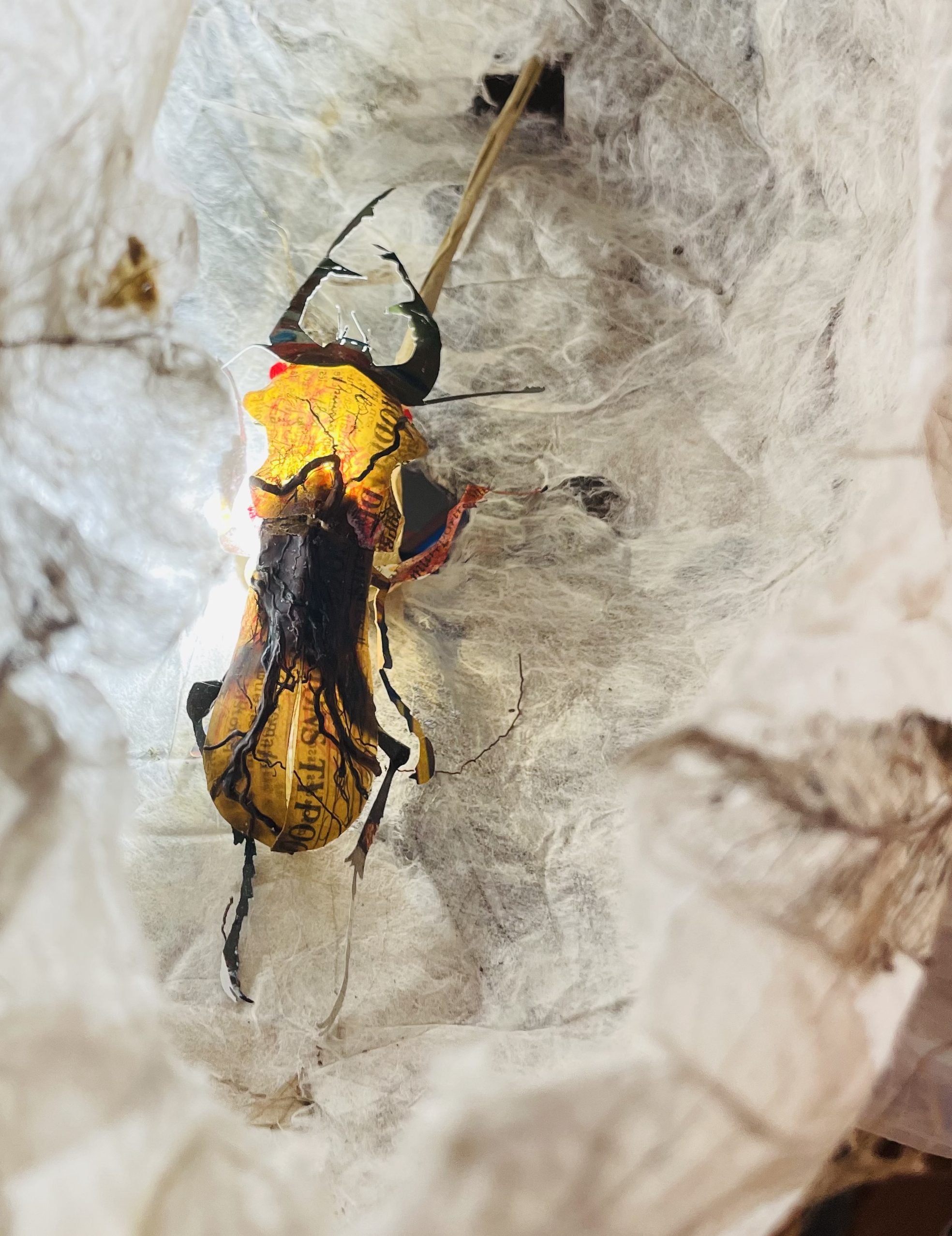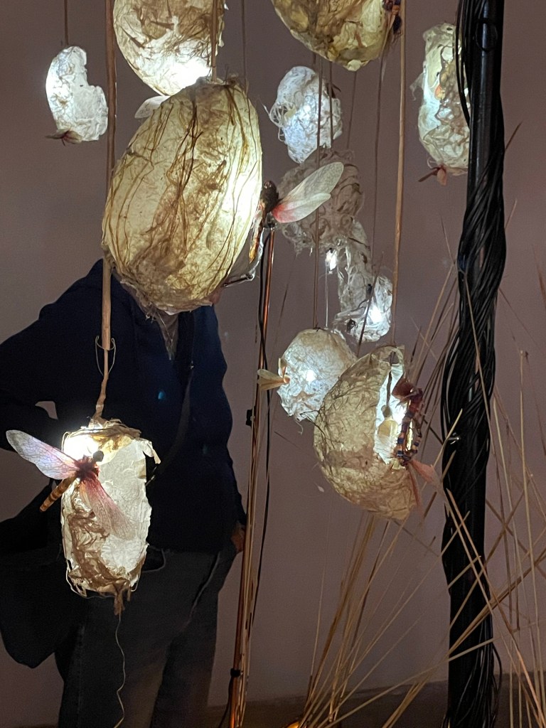 2/ Plus haut, les modulations de hauteur et d’intensité de ces voix déclenchent à leur tour l’illumination variable des habitats des insectes de papiers suspendus, comme si la structure était vivante et « parlait ». Ces insectes, frêles témoins de la disparition de la biodiversité, s’agitent doucement au rythme des courants d’air et du passage du public .